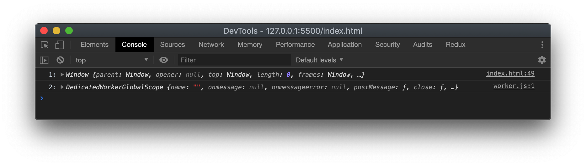 하나는 window, 다른 하나는 DedicatedWorkerGlobalScope로 기록된 모습을 확인할 수 있다.