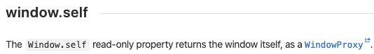 w3c의 문서를 확인해보면, self는 읽기 전용 속성이며 WindowProxy로서의 window 자신을 반환한다고 한다.