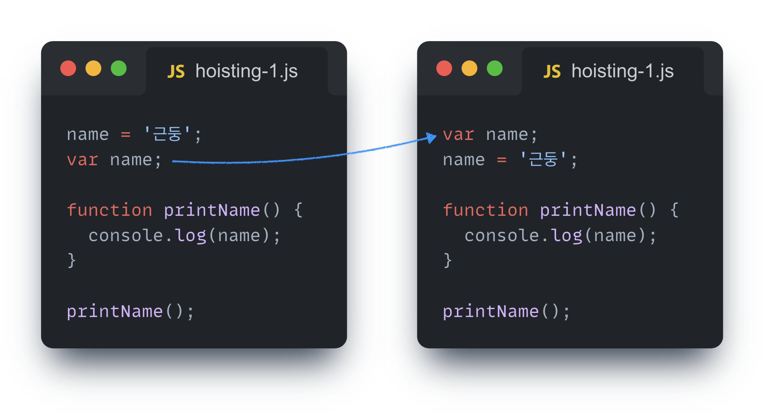 두 예제는 전역 스코프 내에서의 호이스팅을 보여준 예시인데, 아래 예제를 하나 더 살펴보자.