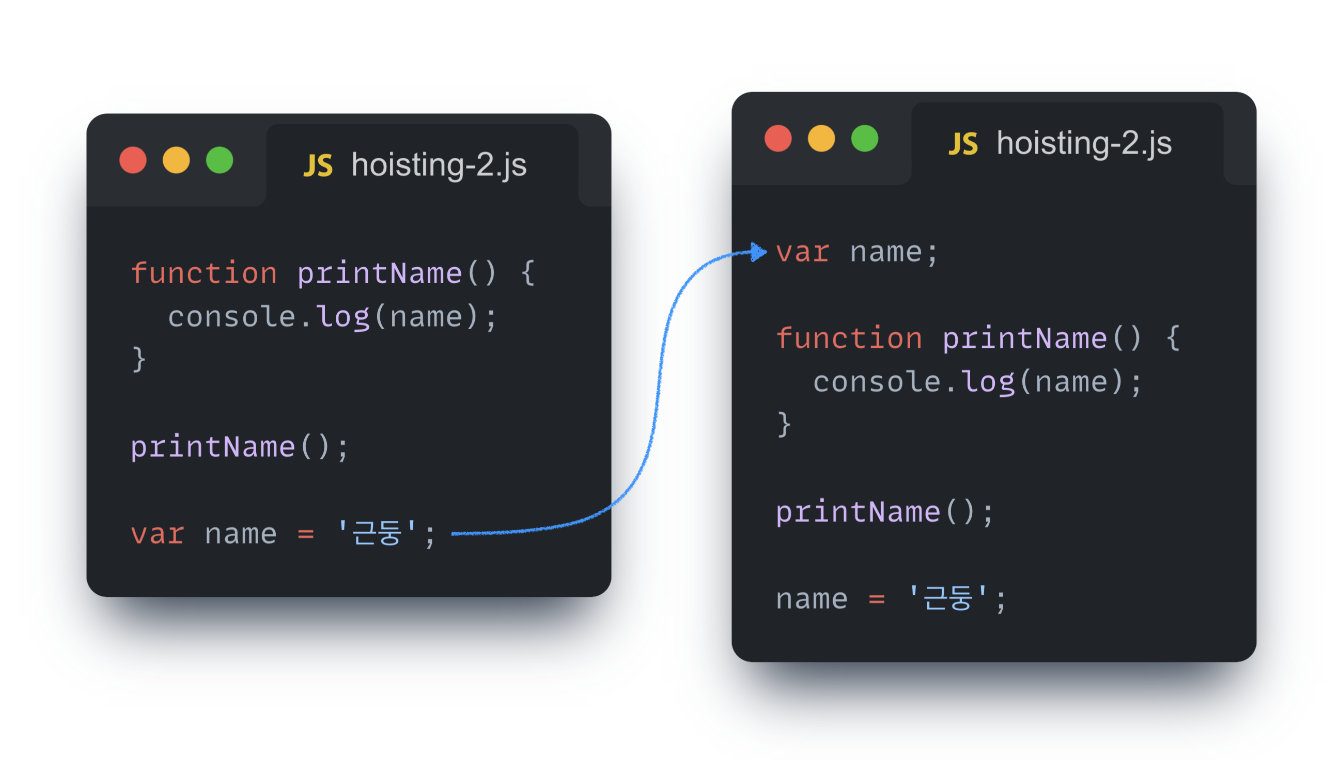 두 예제는 전역 스코프 내에서의 호이스팅을 보여준 예시인데, 아래 예제를 하나 더 살펴보자.