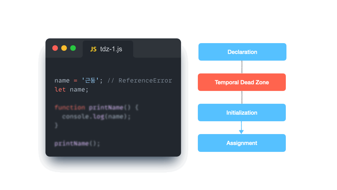 TDZ는 이 절차 중 선언과 초기화 사이에 위치하고 있으며 초기화 이전에 접근할 수 없도록 제한한다.
