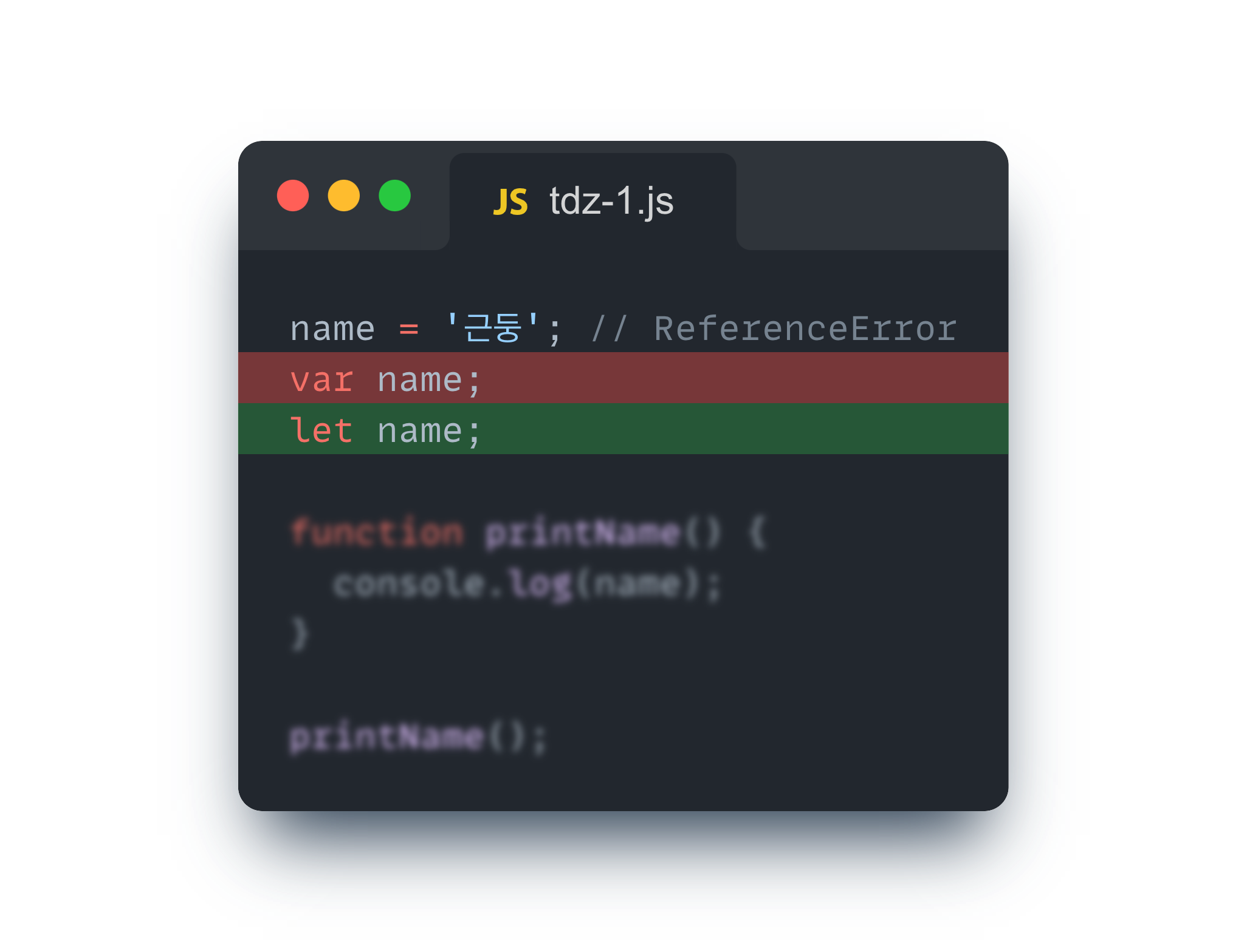 변수 선언이 호이스팅 되어 스코프 최상단으로 끌어올려졌지만, 초기화 이전까지는 TDZ에 속해있기 때문에 접근을 시도할 경우 ReferenceError 가 발생한다.