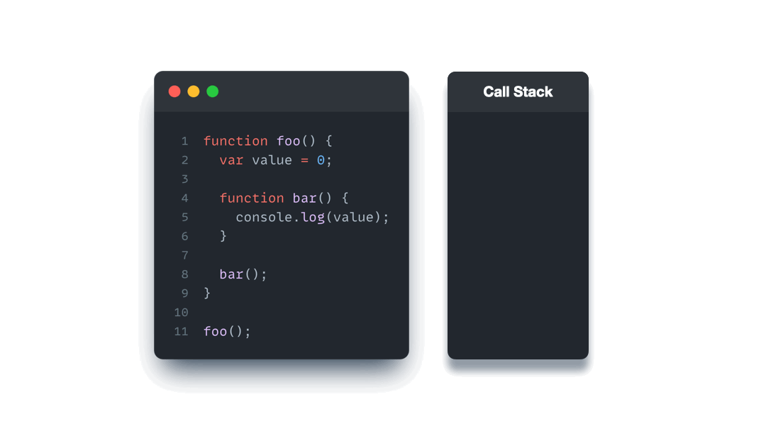 foo 함수 스코프 내에 value 가 선언되어 있고, bar 함수 내에서는 스코프 체이닝을 통해 상위 스코프(foo)에 선언된 value 를 참조한다.