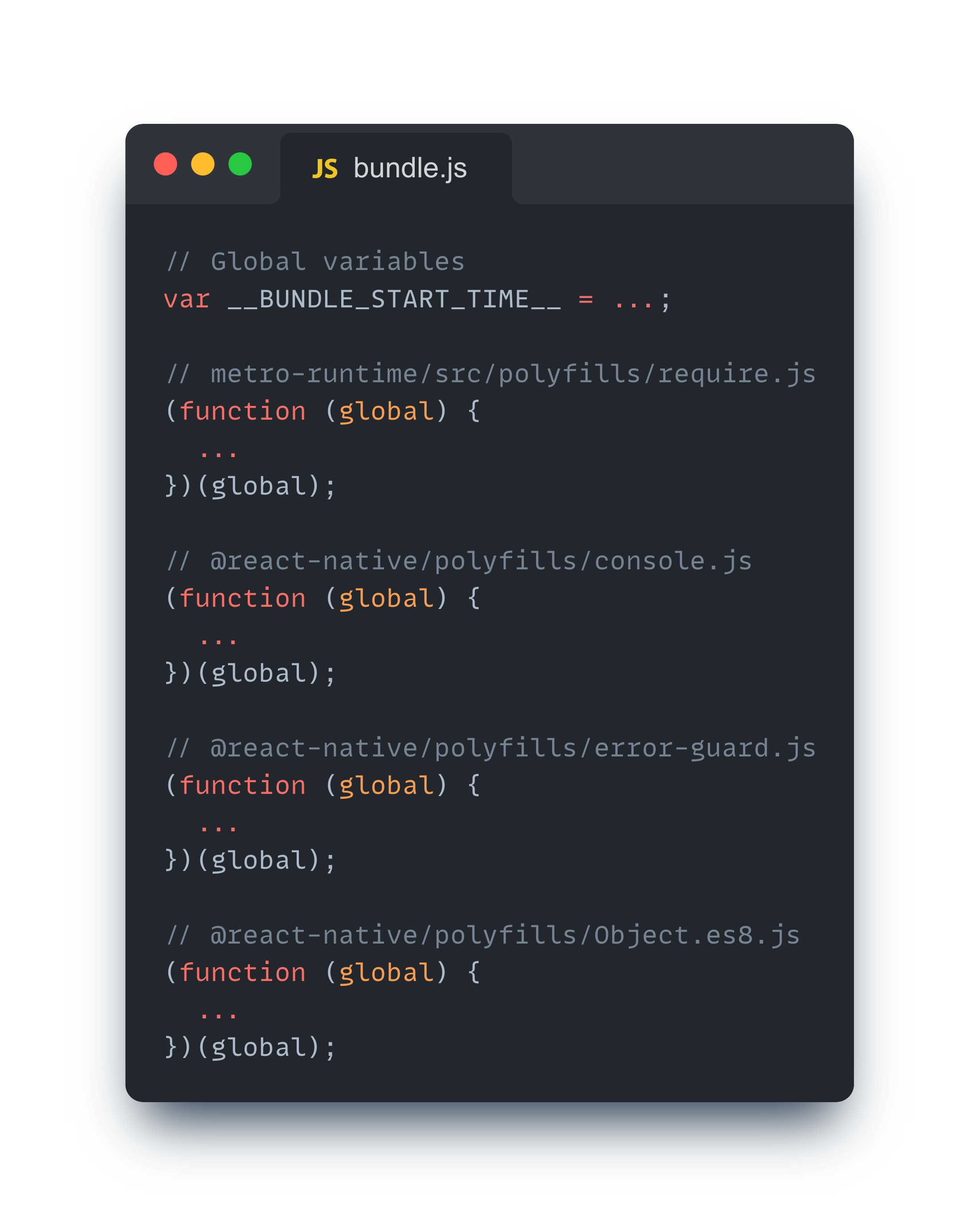 React Native의 경우 모듈뿐만 아니라 기본적인 실행 환경을 구성하기 위해 몇 가지 코드를 주입하고 있다. 여기에는 호환성 혹은 기능 확장을 위한 폴리필(Polyfill) 그리고 초기화 코드가 포함된다.