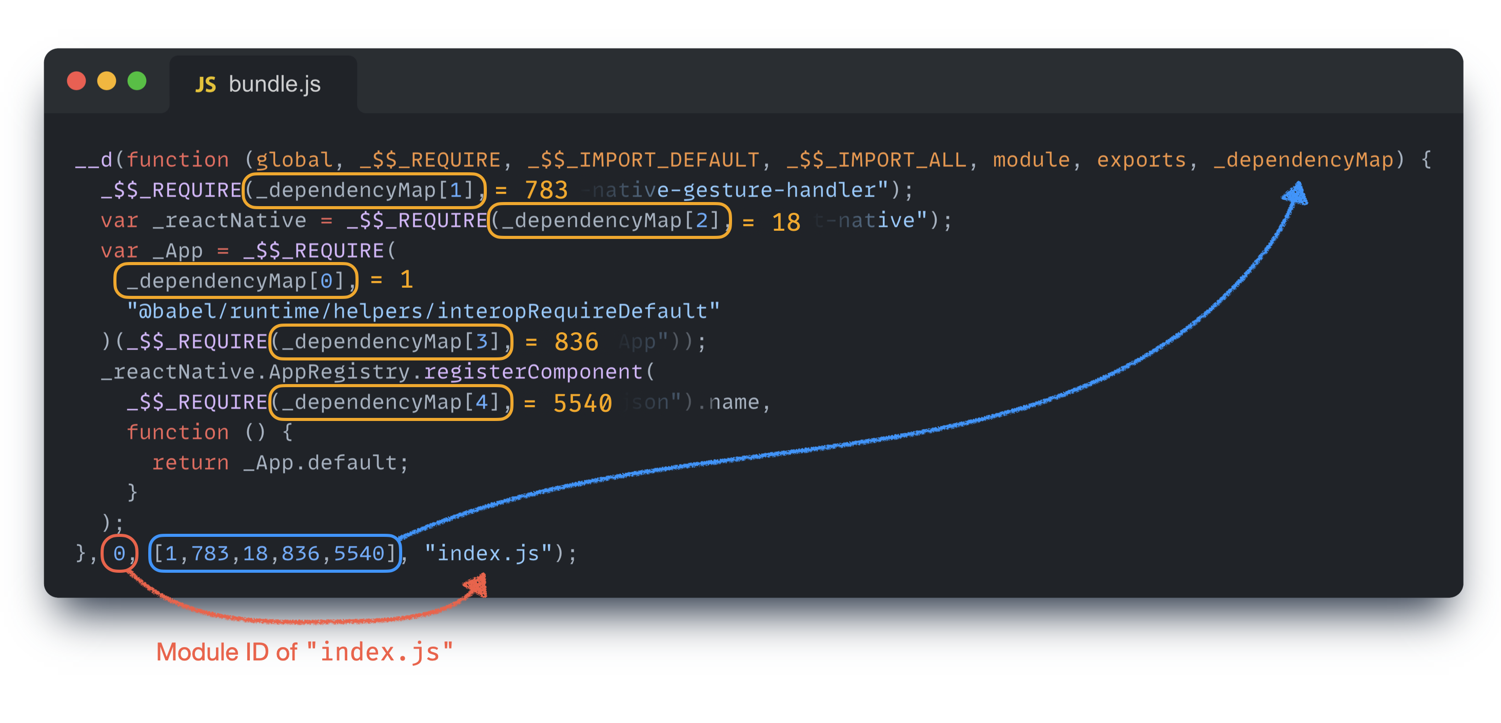 index.js 모듈의 ID 는 0이고, [1, 783, 18, 836, 5540] 배열은 모듈 의존성을 나타낸다. 여기에는 index.js 모듈에서 참조하고 있는 다른 모듈의 ID 가 포함되며 내부에서는 _dependencyMap 을 통해 모듈 ID 값을 참조한다.