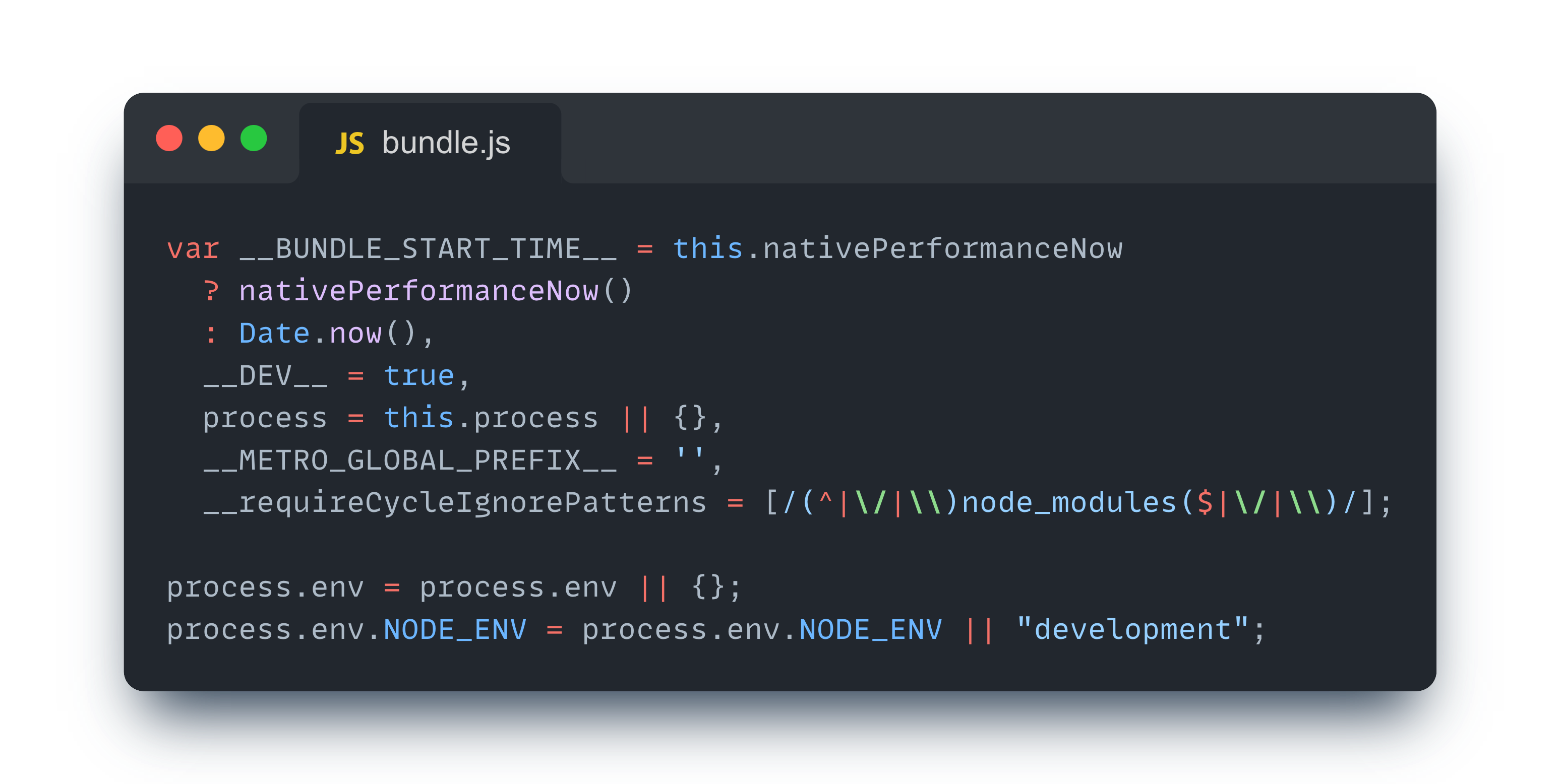 번들 최상단을 보면 전역 변수들이 선언되어있는 것을 확인할 수 있다. 번들 실행 시작 시간을 확인하기 위한 변수, 개발 모드 여부를 나타내는 변수, 환경 변수 등 여러가지 변수가 가장 먼저 선언되고 초기화 된다.