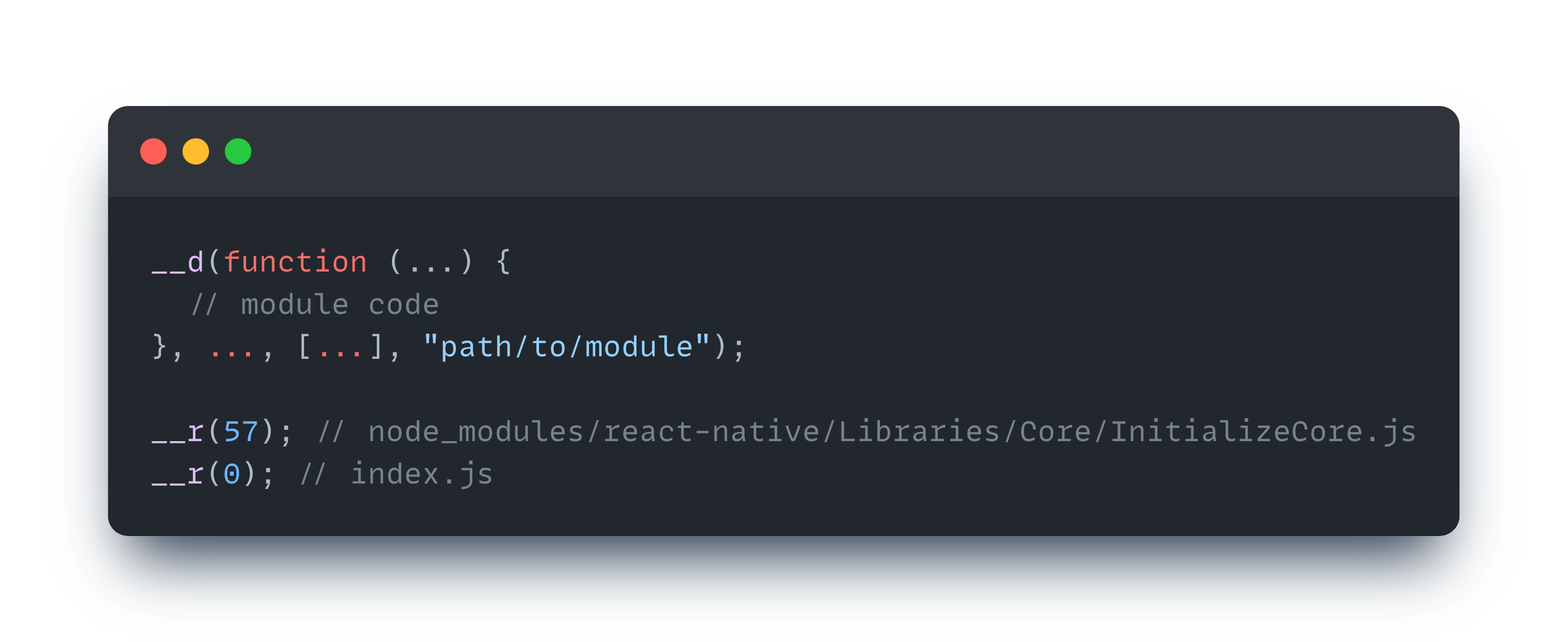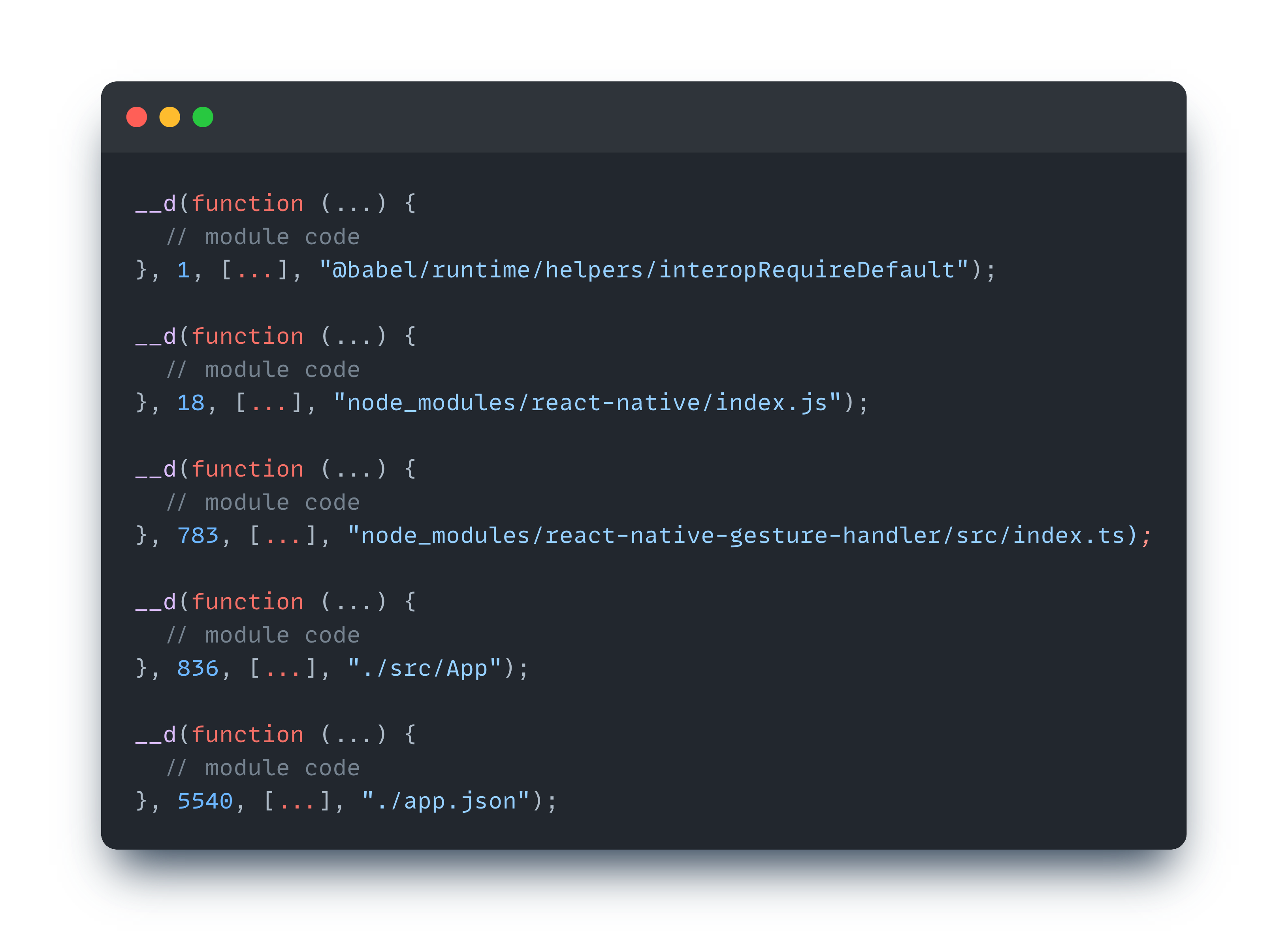 내부 코드를 보면 조금 복잡해 보일 수 있는데, 한 가지 사실만 기억하자. Metro 번들러가 변환한 모든 모듈에는 고유한 ID(숫자)를 갖고 있으며 해당 ID를 통해 모듈간 서로 참조(require)한다.