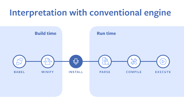 기존에는 빌드 타임 이후 생성된 결과물인 번들을 런타임에 파싱하고 컴파일하여 실행하는 과정을 거치게 된다. 대부분의 디바이스에서는 문제가 되지 않지만 저사양(Low-end) 기기에서는 이러한 과정이 초기 실행 속도를 늦추게 되는 원인이 된다.