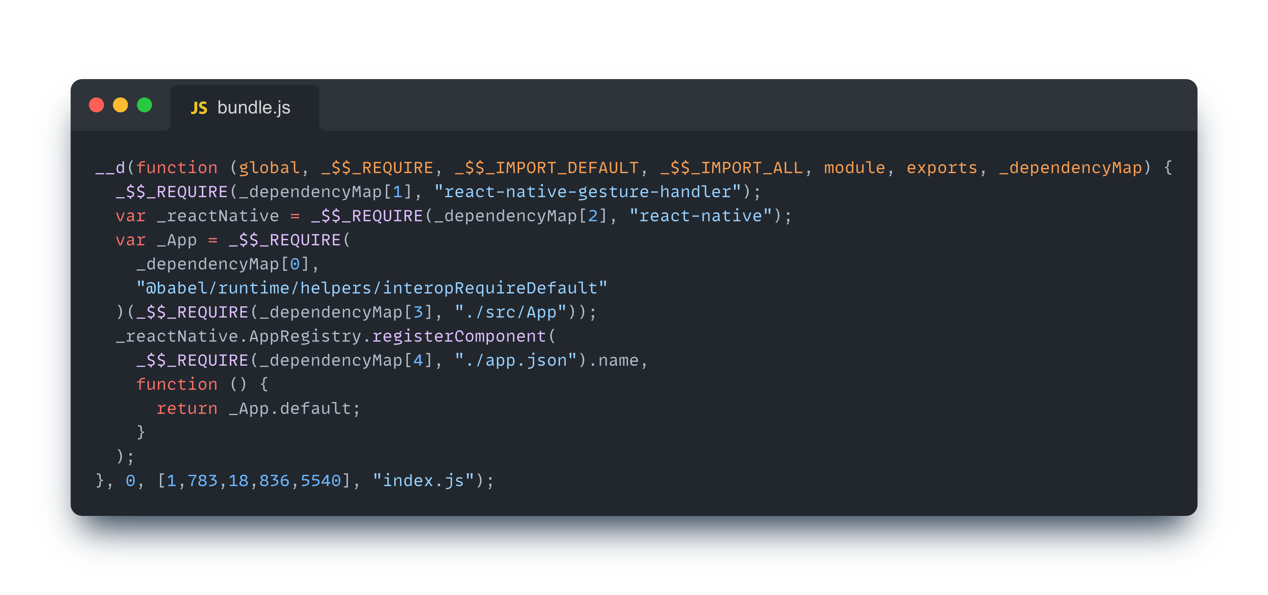 내부 코드를 보면 조금 복잡해 보일 수 있는데, 한 가지 사실만 기억하자. Metro 번들러가 변환한 모든 모듈에는 고유한 ID(숫자)를 갖고 있으며 해당 ID를 통해 모듈간 서로 참조(require)한다.
