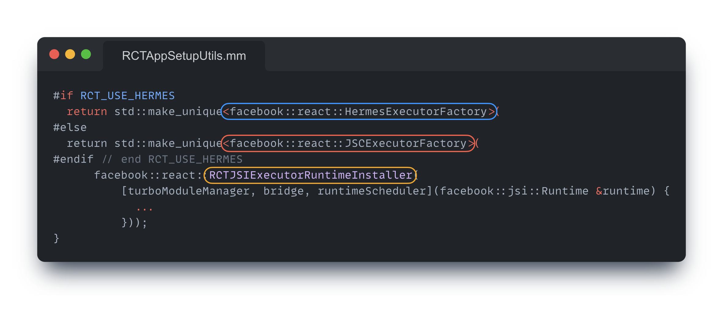 RCTAppSetupUtils.mm 내에 정의되어 있는 RCTAppSetupDefaultJsExecutorFactory 혹은 RCTAppSetupJsExecutorFactoryForOldArch 의 내부 구현을 살펴보도록 하자.