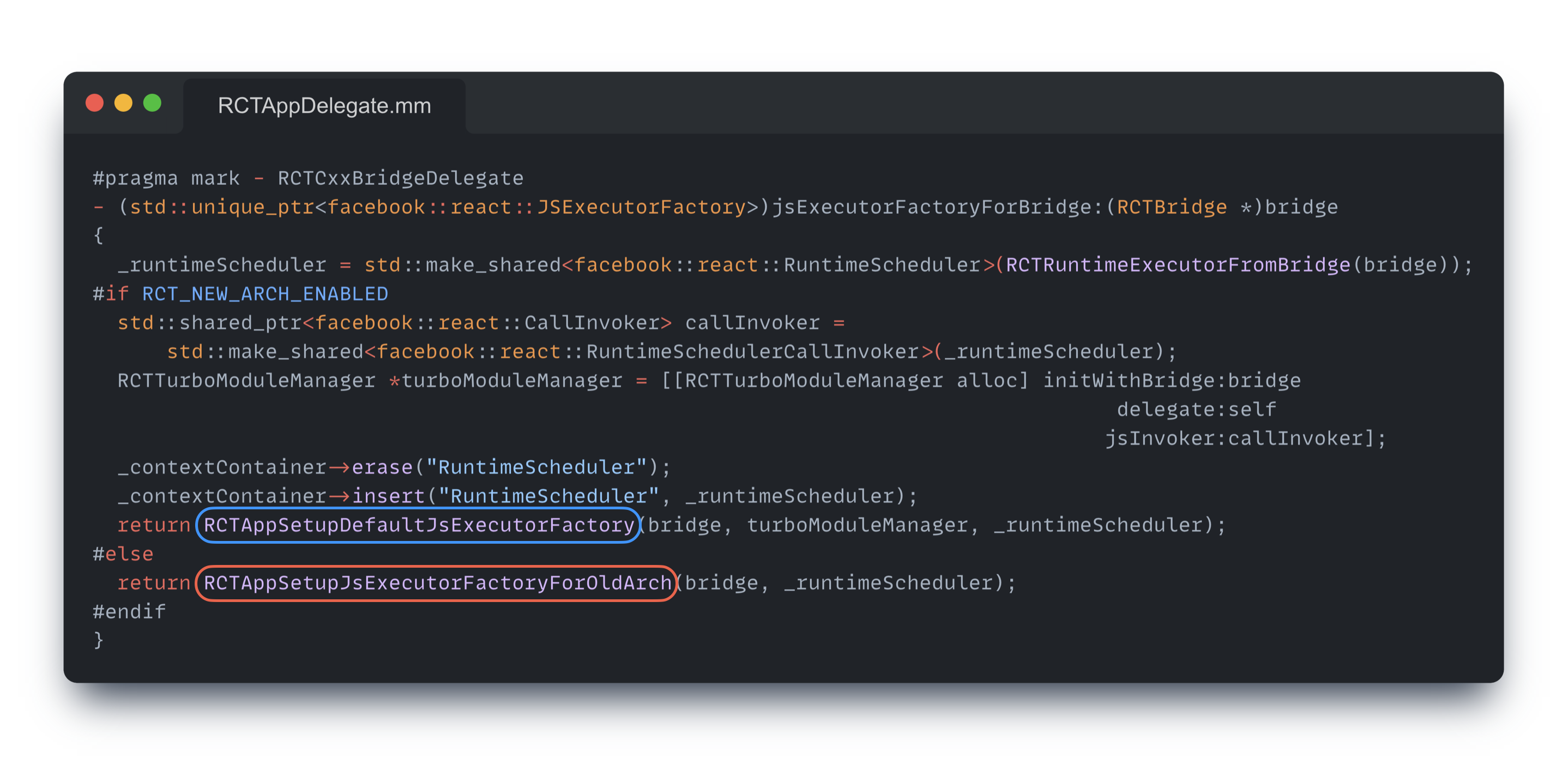 RCTAppDelegate 는 우리의 프로젝트에서 확인할 수 있는 AppDelegate 의 기반이다. 특정 프로젝트에서는 jsExecutorFactoryForBridge 를 오버라이드 하여 사용하고 있을 수도 있는데 이는 개발 중인 프로젝트에 따라 다른 부분이니 넘어가도록 하고, jsExecutorFactoryForBridge 를 확인해 보면 내부에서 RCT_NEW_ARCH_ENABLED 값에 따라 RCTAppSetupDefaultJsExecutorFactory 혹은 RCTAppSetupJsExecutorFactoryForOldArch 를 호출하고 있는 것을 확인할 수 있다.