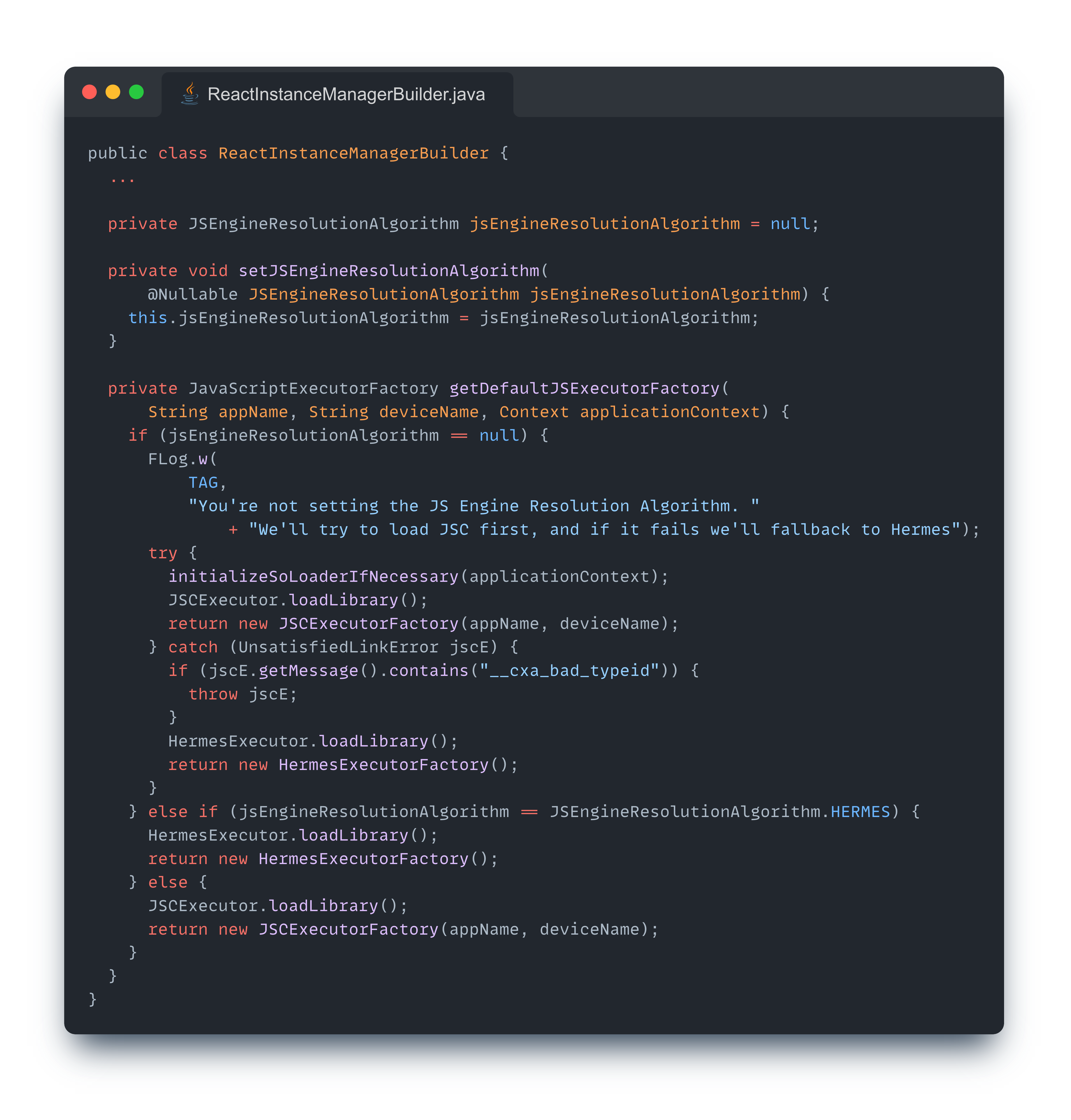 ReactInstanceManagerBuilder 에서 ReactInstanceManager 인스턴스를 생성할 때, JavaScriptExecutorFactory 가 null 그리고 jsEngineResolutionAlgorithm 이 null 일 때에는 아래의 코드가 실행된다.