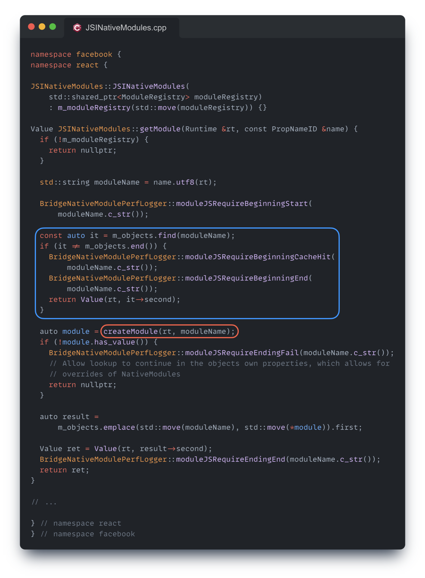 NativeModuleProxy 구현체를 살펴보면 getter 가 구현되어 있는데, JSINativeModules 의 getModule을 통해 네이티브 모듈을 가져온다. 구현되어 있는 코드를 한 번 살펴보자.