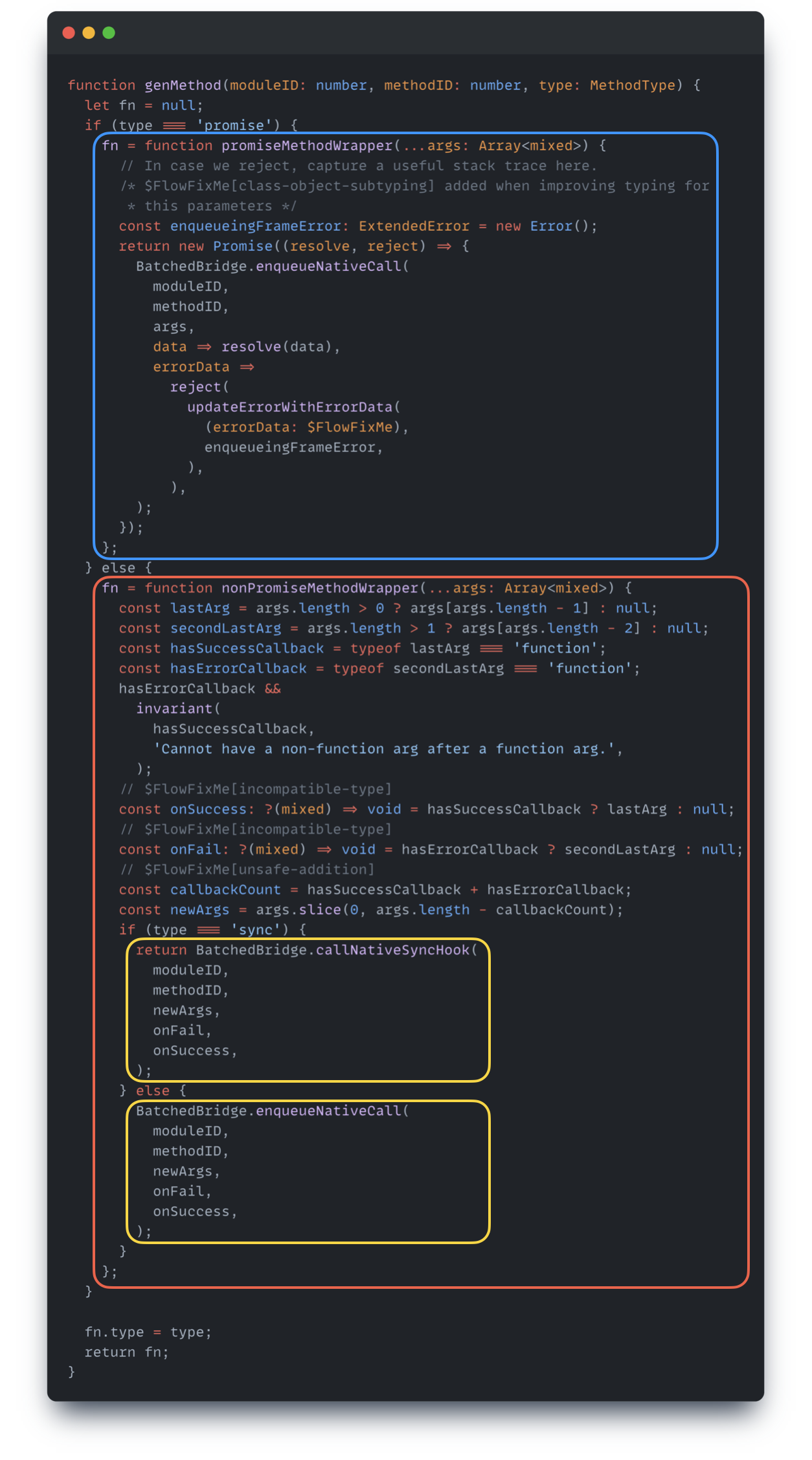 비동기로 동작하는 메소드(async, promise)는 콜백(Callback) 혹은 프로미스(Promise)로 래핑 되어있고, 최종적으로는 BatchedBridge.enqueueNativeCall 을 호출한다.