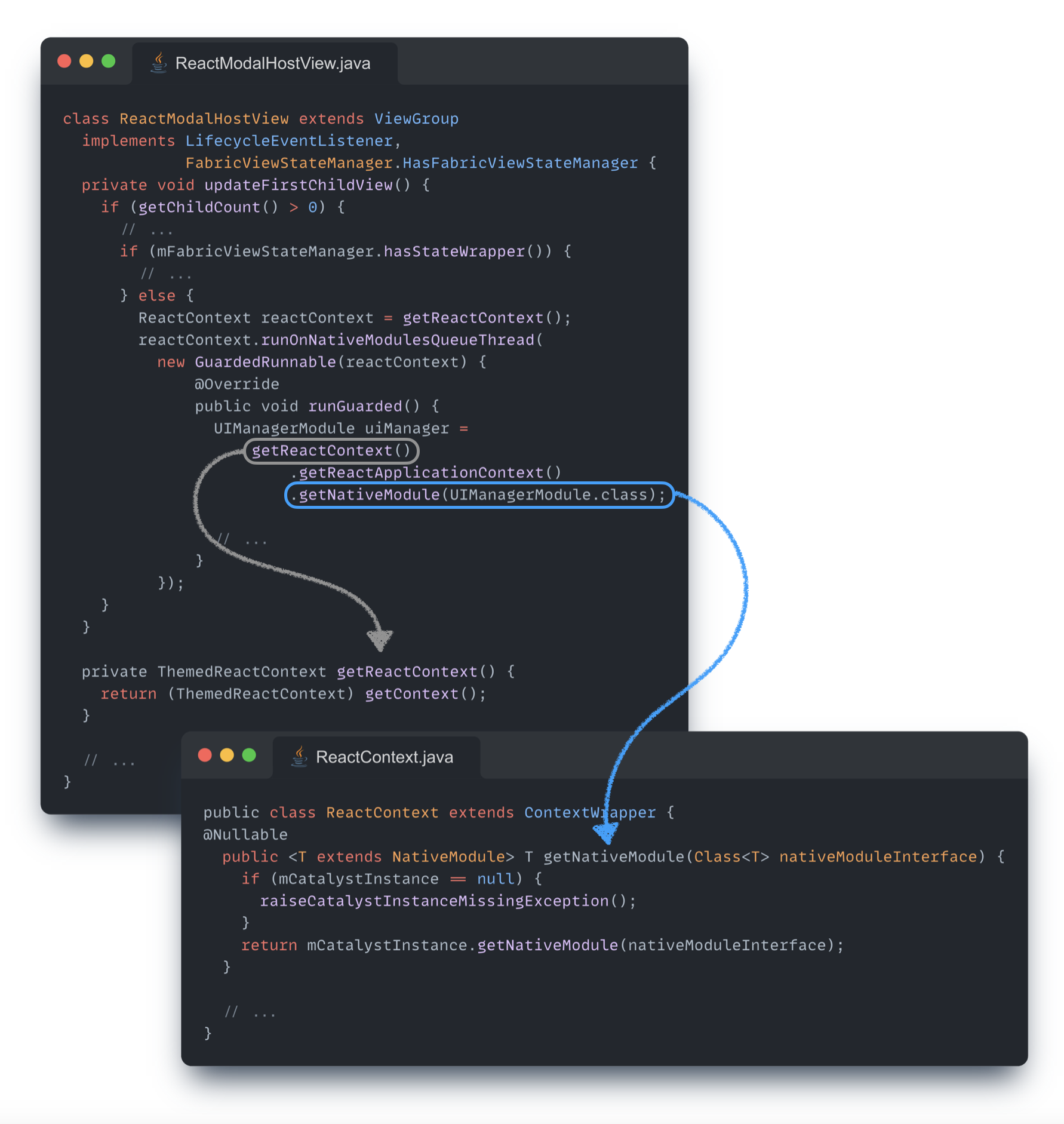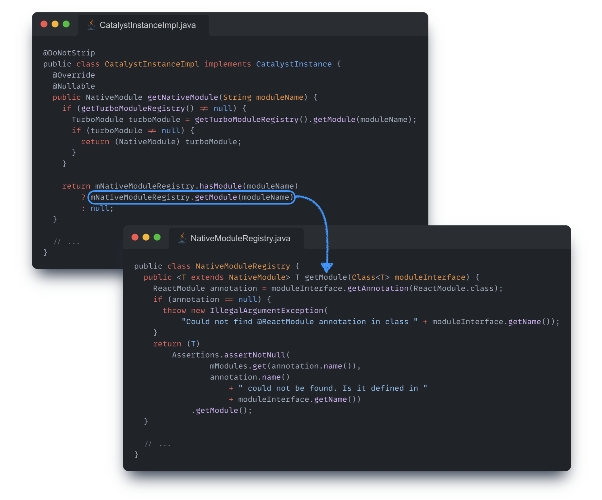 React Native에서 기본적으로 제공하는 모달(Modal)의 구현체를 확인해 보면, 아래와 같이 네이티브 모듈을 참조하고 있는 코드를 확인할 수 있는데, 코드의 흐름을 따라가 보면 ReactModalHostView -> ReactContext.getNativeModule -> CatalystInstance.getNativeModule -> NativeModuleRegistry.getModule 순서로 호출되는 것을 확인할 수 있다.
