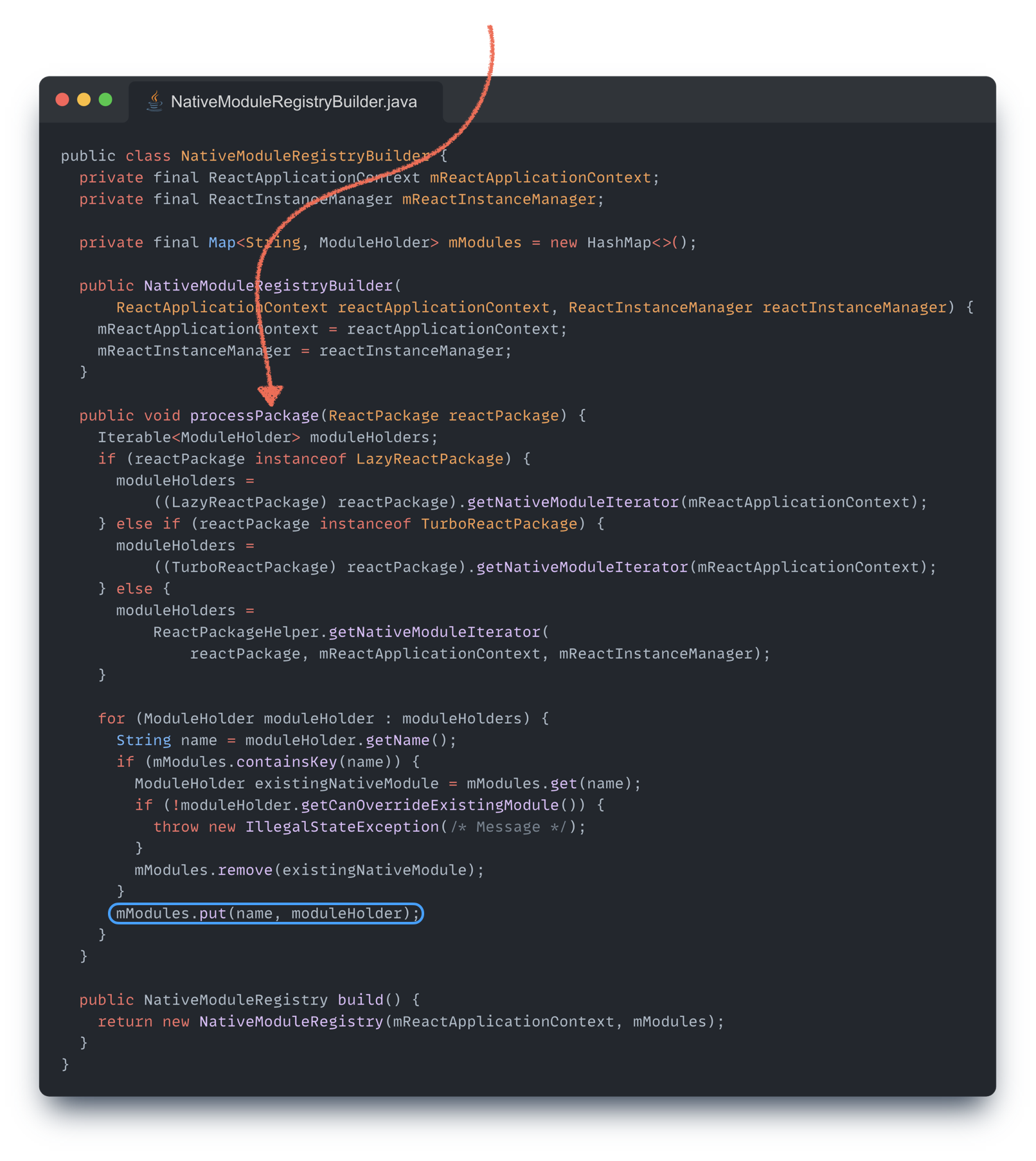 여기서 노란색으로 강조해 둔 부분을 잘 기억하도록 하고, NativeModuleRegistryBuilder 내에서 어떤 일들이 일어나는지 이어서 확인해 보자.