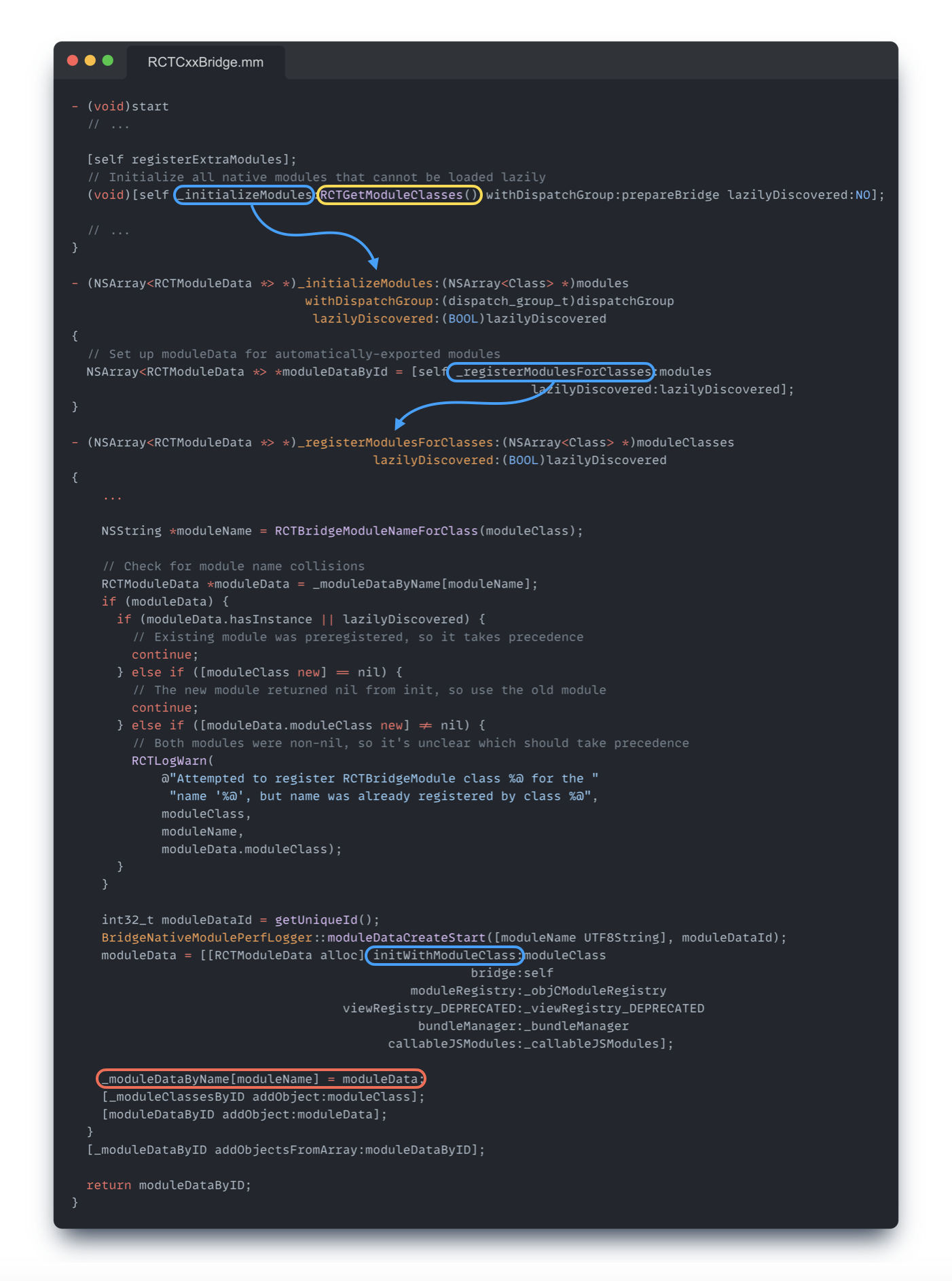 등록된 모듈들은 _registerModulesForClasses 메소드 내에서 초기화가 이루어진 후 _moduleDataByName 딕셔너리에 저장되는데, 이때 key는 모듈의 이름이고 value는 RCTModuleData 이다.