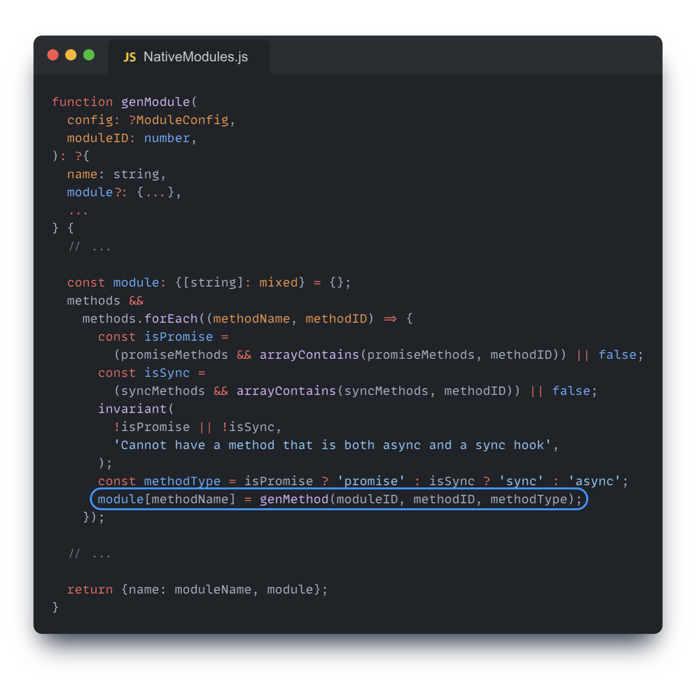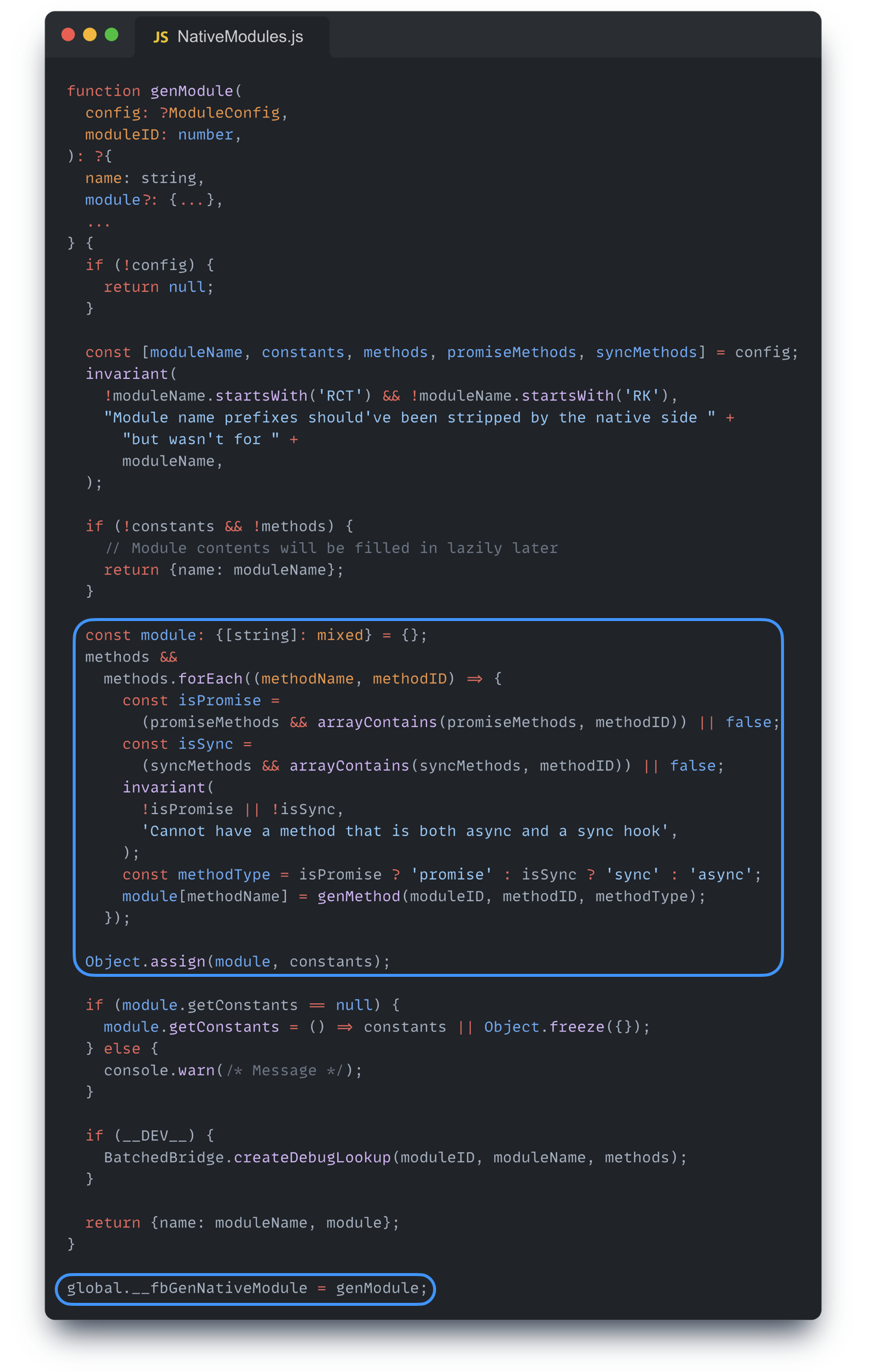 genModule 은 네이티브로부터 전달받은 구성(config)과 모듈 ID(moduleID)를 가지고 자바스크립트 객체 형태의 모듈을 생성하는 코드이다.