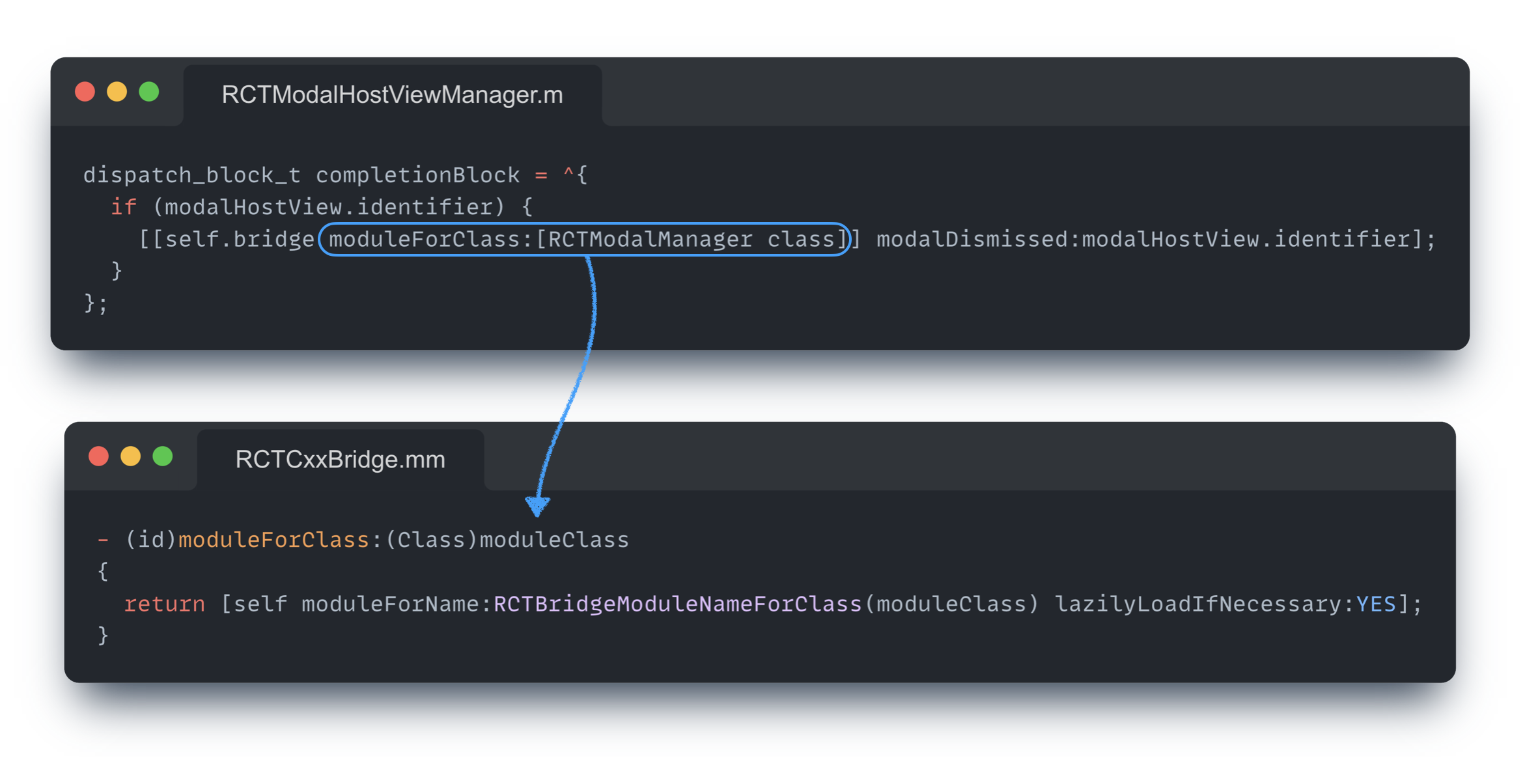 이렇게 등록된 모듈은 moduleForName, moduleForClass 메소드를 통해 참조하게 되는데, 안드로이드에서 확인했던 것과 동일하게 React Native 모달 구현체인 RCTModalHostViewManager를 살펴보면 아래와 같이 모듈을 참조하고 있음을 확인할 수 있다.