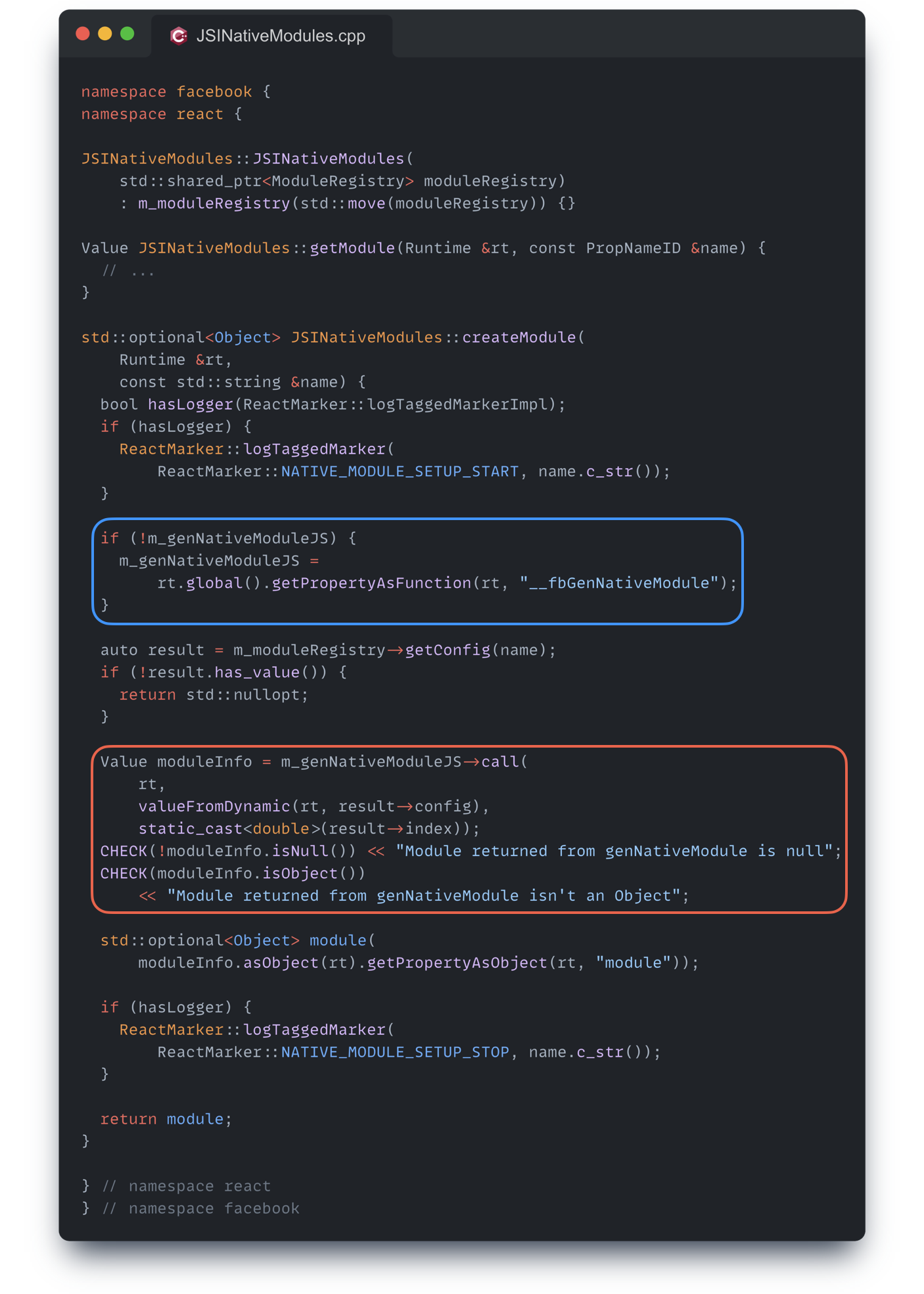 먼저, 자바스크립트 런타임의 전역 객체에서 __fbGenNativeModule 프로퍼티의 값을 함수로 가져와 m_genNativeModuleJS 멤버변수에 저장한다. 이렇게 저장된 함수는 모듈을 생성할 때 호출되며, 함수의 인자로는 모듈 생성을 위한 구성 정보와 모듈 ID에 해당하는 숫자 값이 전달된다.