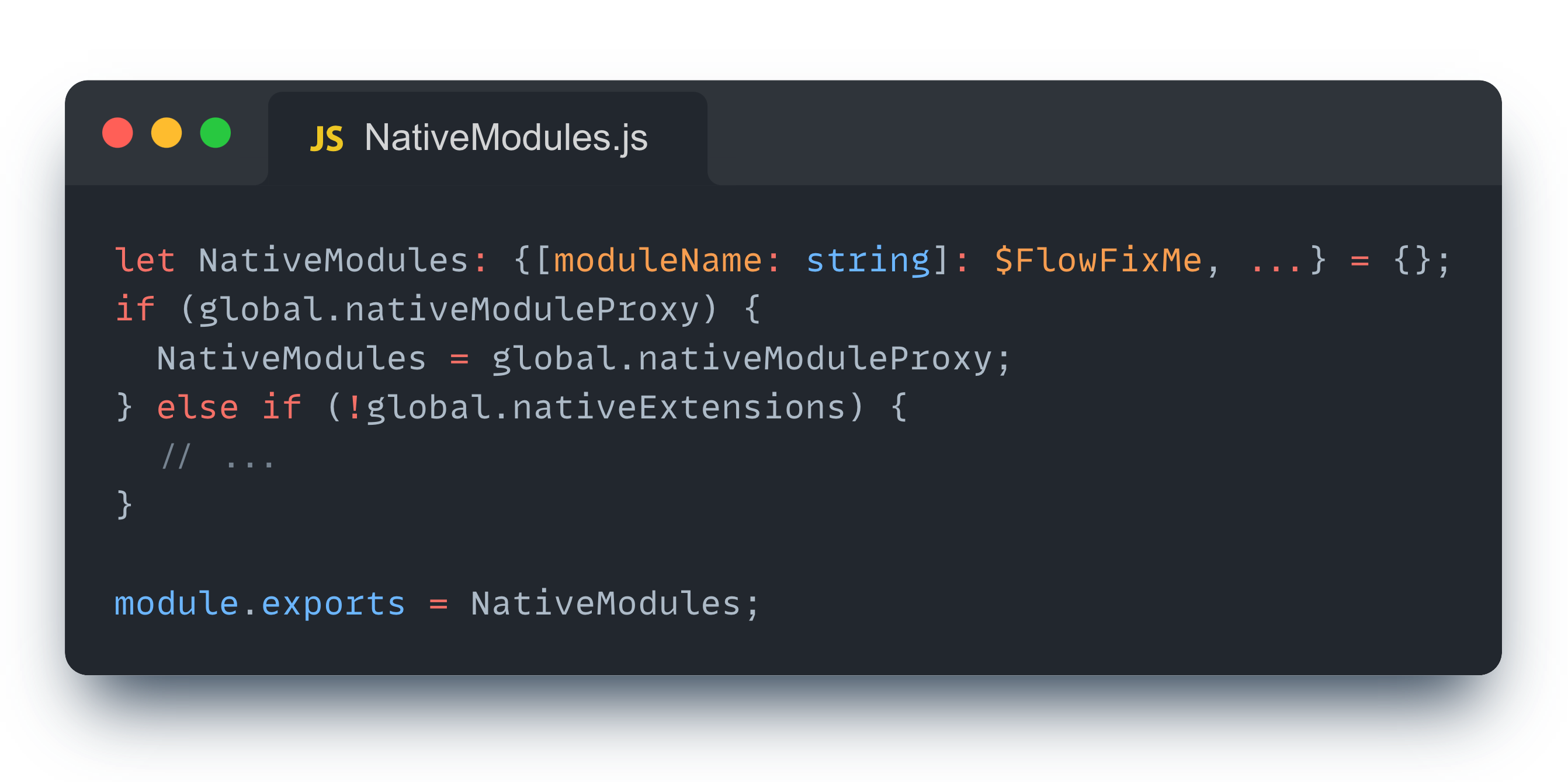 지금까지 여러 과정을 거쳐 자바스크립트 전역 컨텍스트에 노출된 nativeModuleProxy 는 NativeModule 모듈에서 참조되며, NativeModules 라는 이름으로 export 된다.