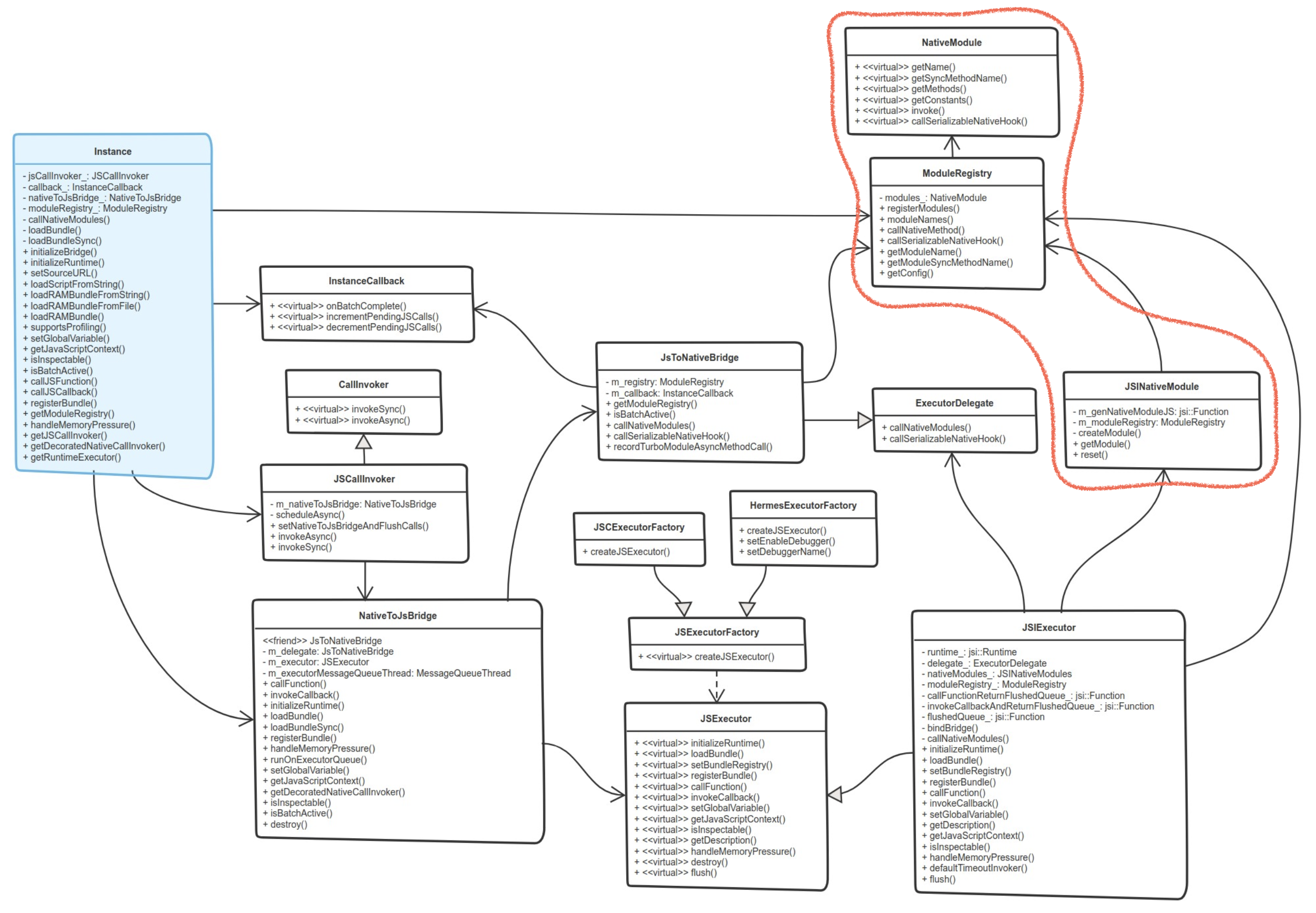 지난 글에서 소개했던 다이어그램이다. 이번 글에서는 빨간색으로 강조한 네이티브 모듈 부분을 살펴보려고 한다.