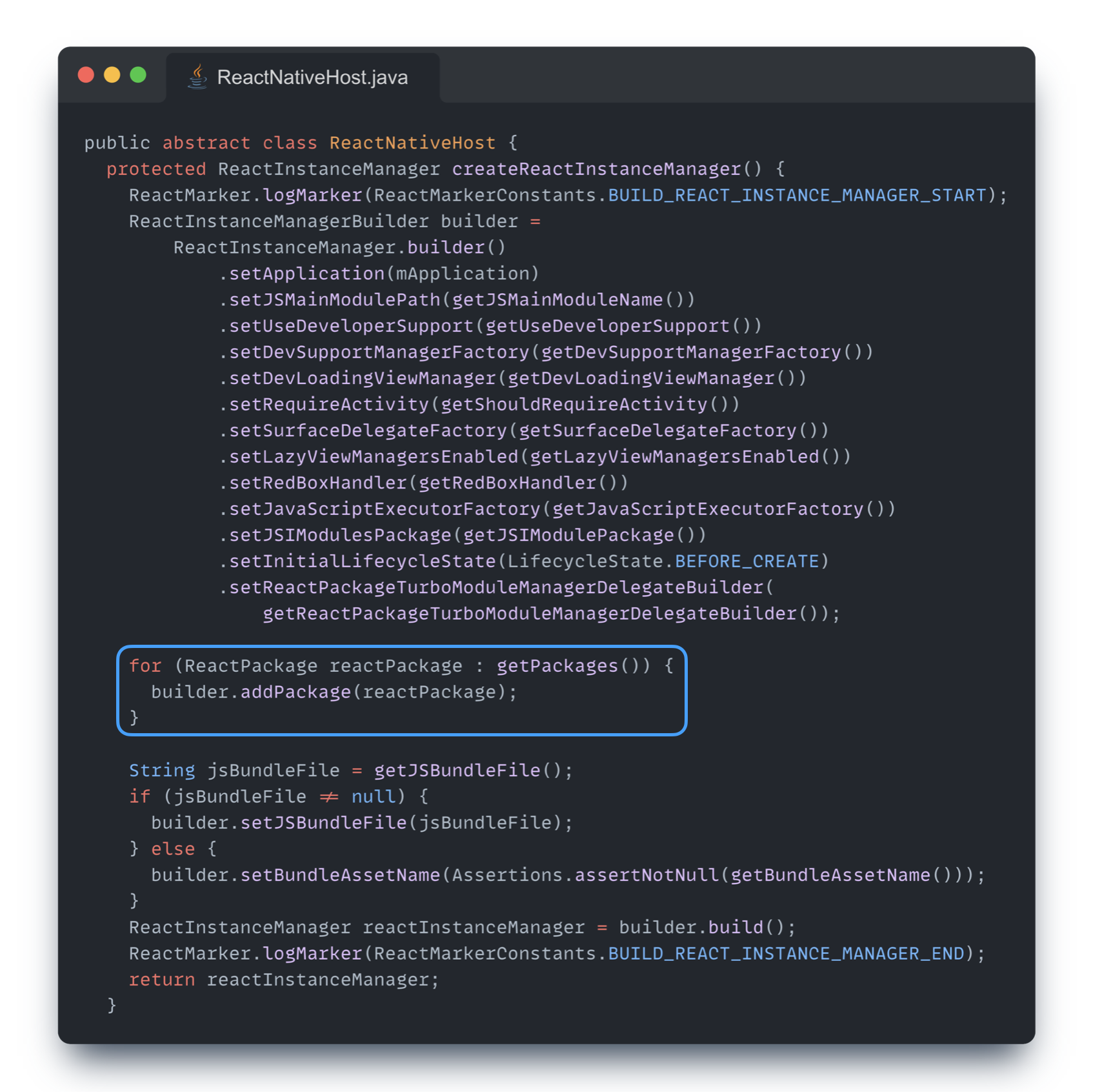 이렇게 등록된 패키지들은 ReactInstanceManager 인스턴스가 생성될 때 사용되며 ReactNativeHost의 getPackages 메소드를 통해 전달된다.