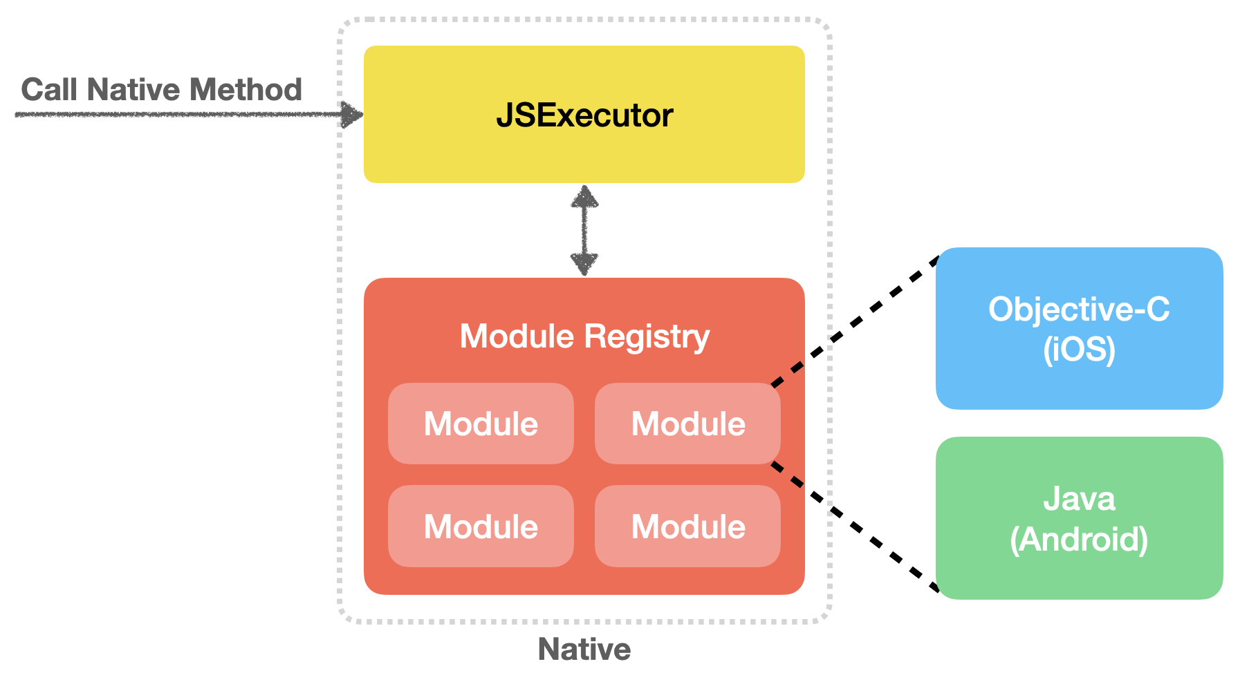 각 플랫폼에 맞게 구현된 네이티브 모듈은 앱 초기화 시점에 저장소에 등록된다. 등록된 네이티브 모듈은 프록시 객체를 통해 자바스크립트 런타임에 노출되고, 프록시 객체로부터 네이티브 모듈의 메소드가 호출되면 모듈 ID, 메소드 ID가 브릿지를 통해 네이티브로 전달된다. 최종적으로 저장소에서 ID에 해당하는 모듈을 탐색하고 해당하는 메소드를 호출하여 동작을 수행하게 된다.
