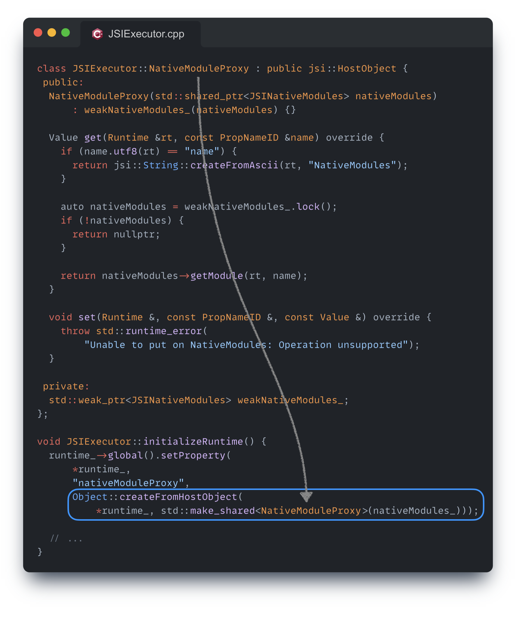 지난 글에서 자바스크립트 런타임에 대해 설명하면서 JSIExecutor 를 소개했다. 런타임 초기화 시 몇 가지 기능들을 자바스크립트 전역 컨텍스트에 노출시킨다고 이야기했는데, 그중 네이티브 모듈에 접근할 수 있도록 하는 nativeModuleProxy 를 노출시킨다.