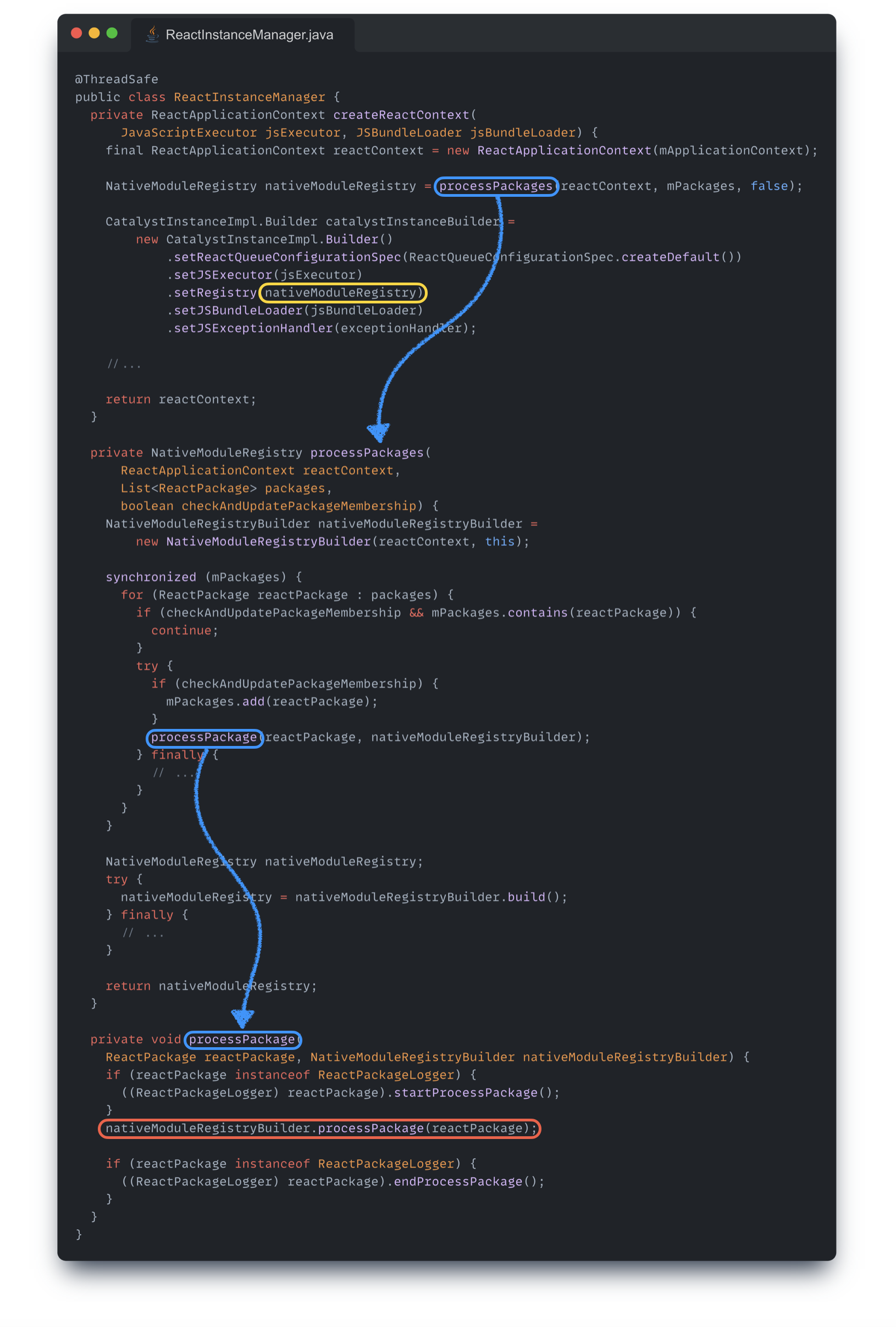 여기서 노란색으로 강조해 둔 부분을 잘 기억하도록 하고, NativeModuleRegistryBuilder 내에서 어떤 일들이 일어나는지 이어서 확인해 보자.