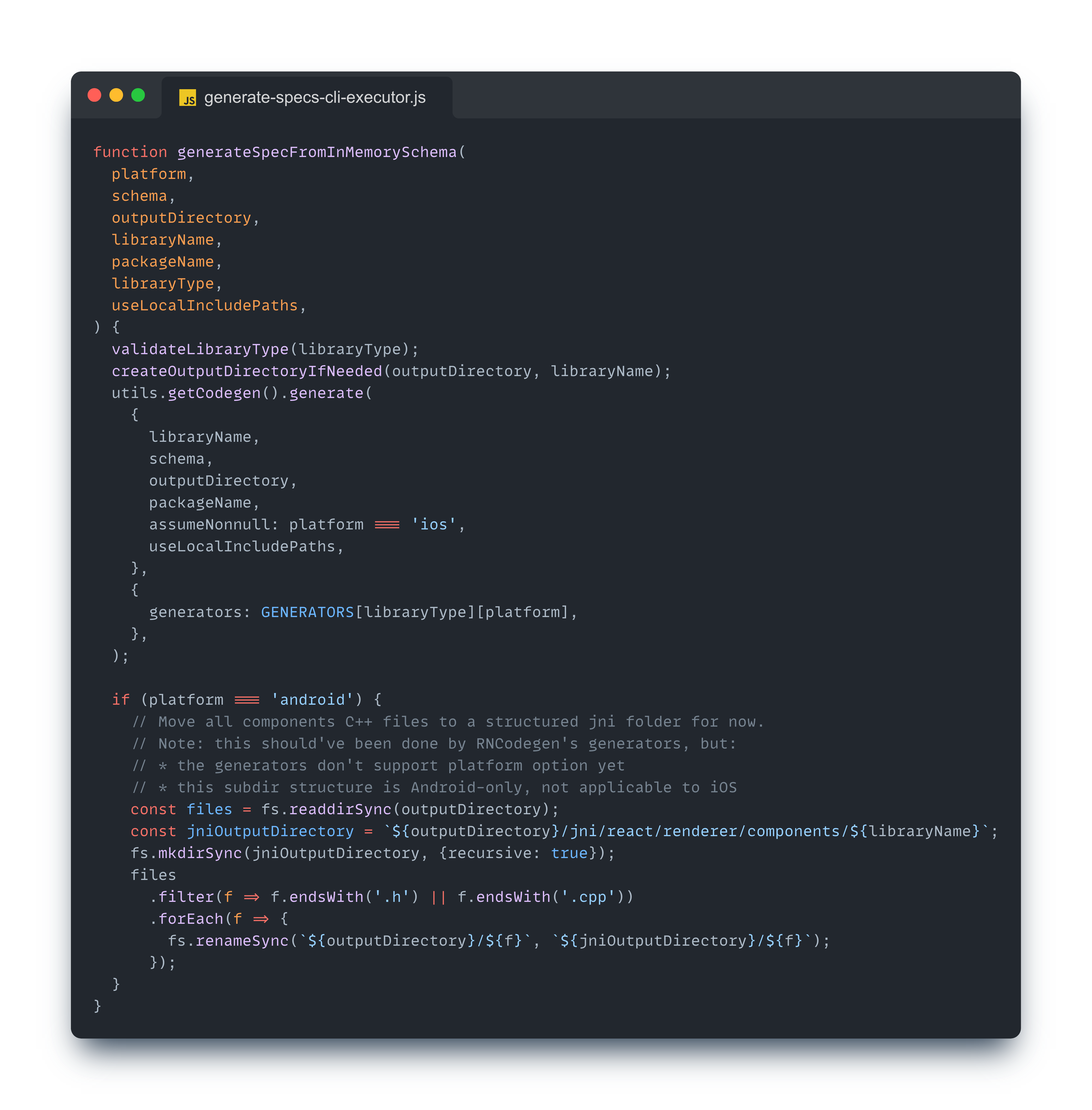 추가로, 마지막 부분에서 플랫폼이 안드로이드인 경우, 생성된 .cpp, .h 파일들을 {OUTPUT_DIR}/jni/react/renderer/components/{LIBRARY_NAME} 경로로 이동시키는 부분도 확인해 볼 수 있다.