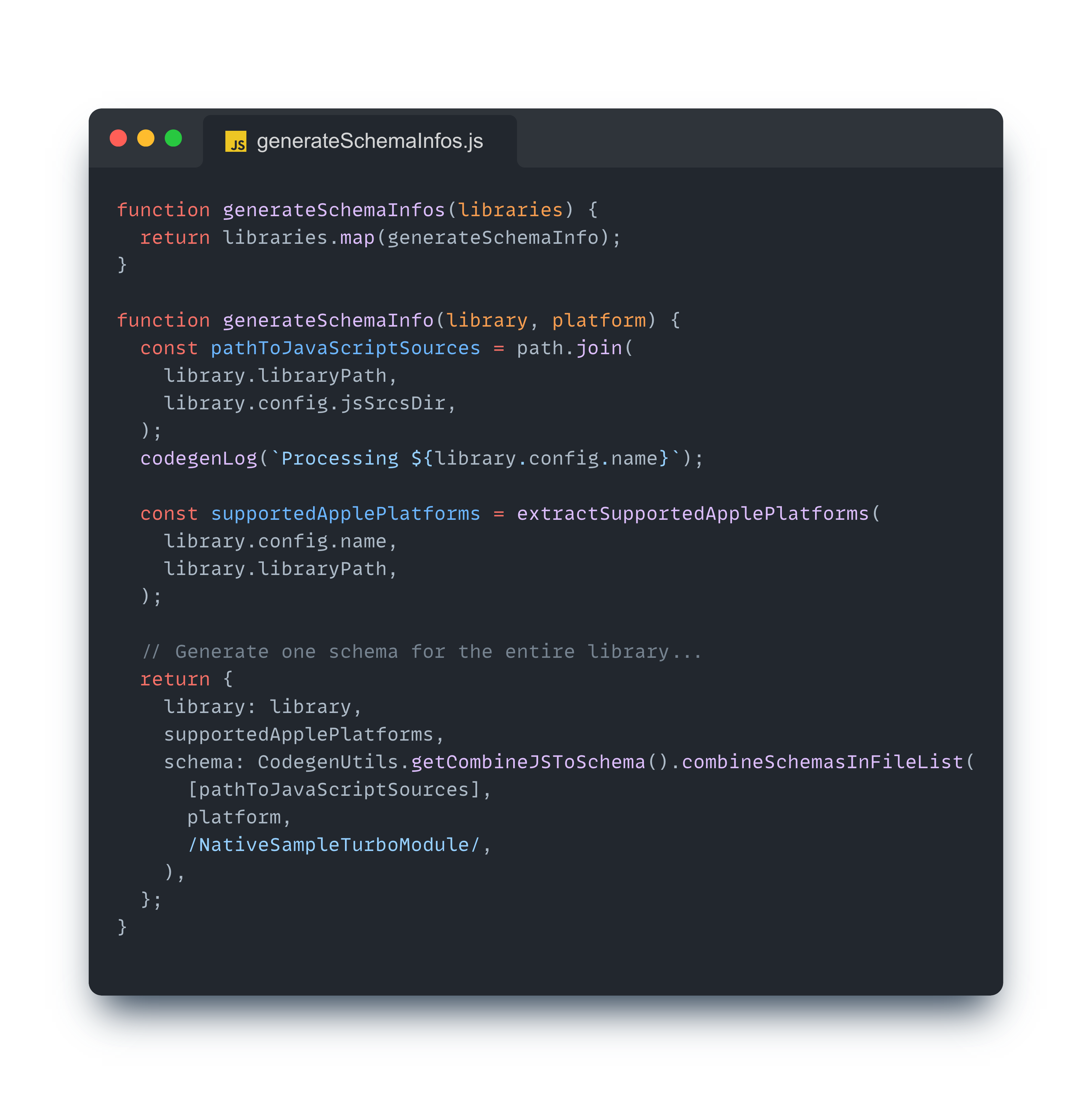 애플 플랫폼 추출 이후에는 CodegenUtils.getCombineJSToSchema().combineSchemasInFileList()를 호출하여 codegenConfig.jsSrcsDir 경로 내에 포함된 .js, .ts, .tsx 파일을 찾는다.