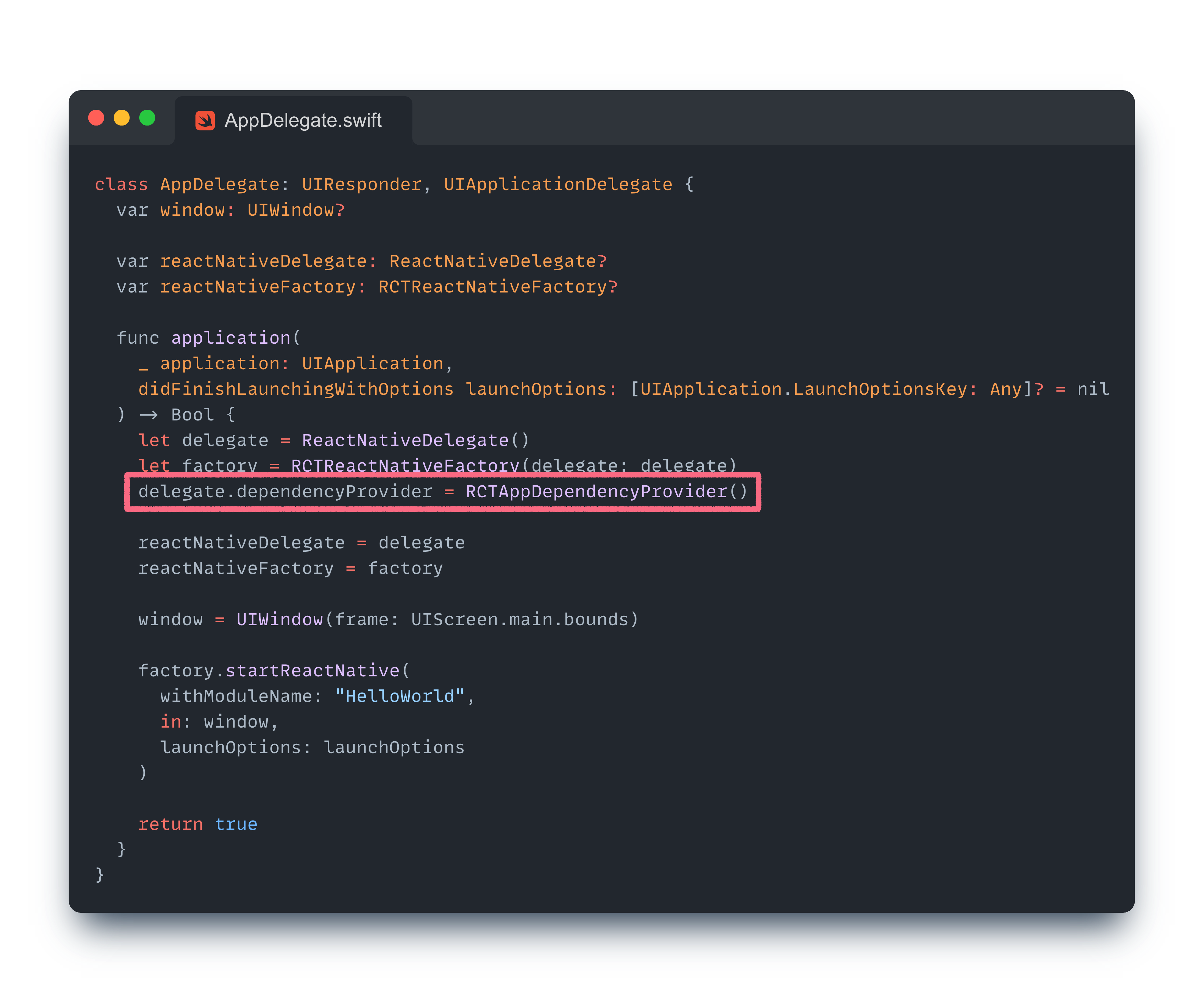 마지막으로, AppDelegate 파일을 보면 Codegen으로 생성된 RCTAppDependencyProvider를 참조하고 있는 것을 볼 수 있다.