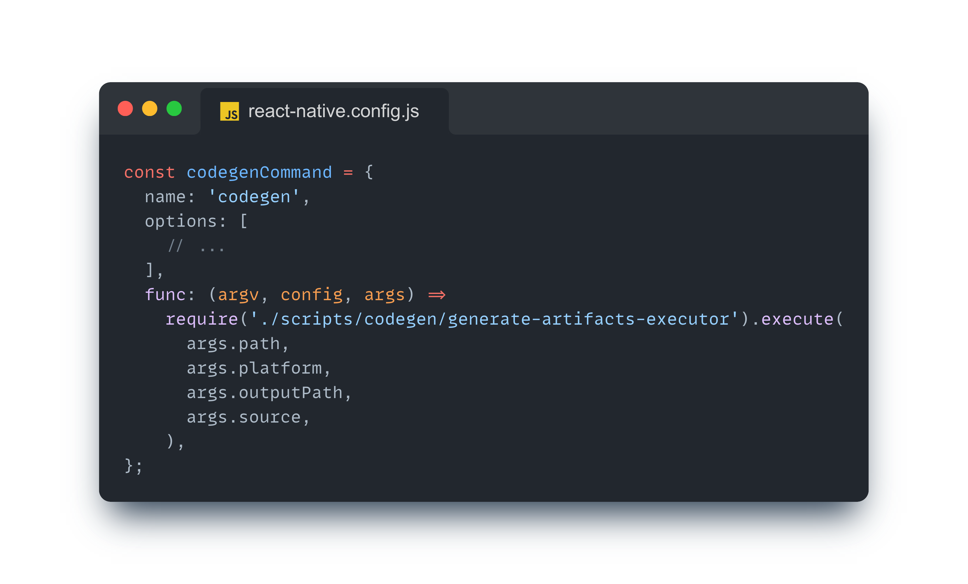 Codegen 명령어는 기본 react-native.config.js 파일 내에서 등록되고 있고, 명령어의 실제 구현체는 generate-artifacts-executor 이다.
