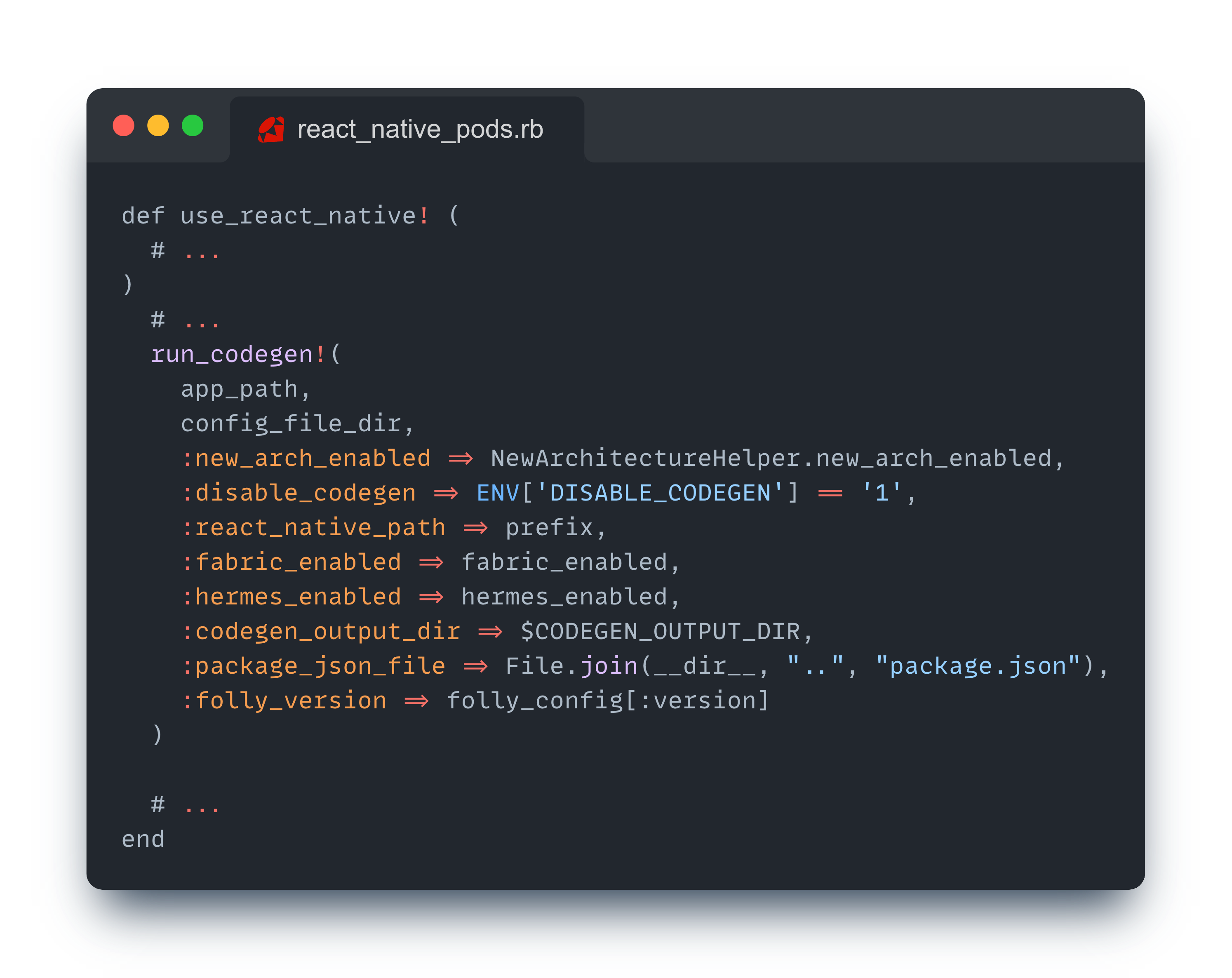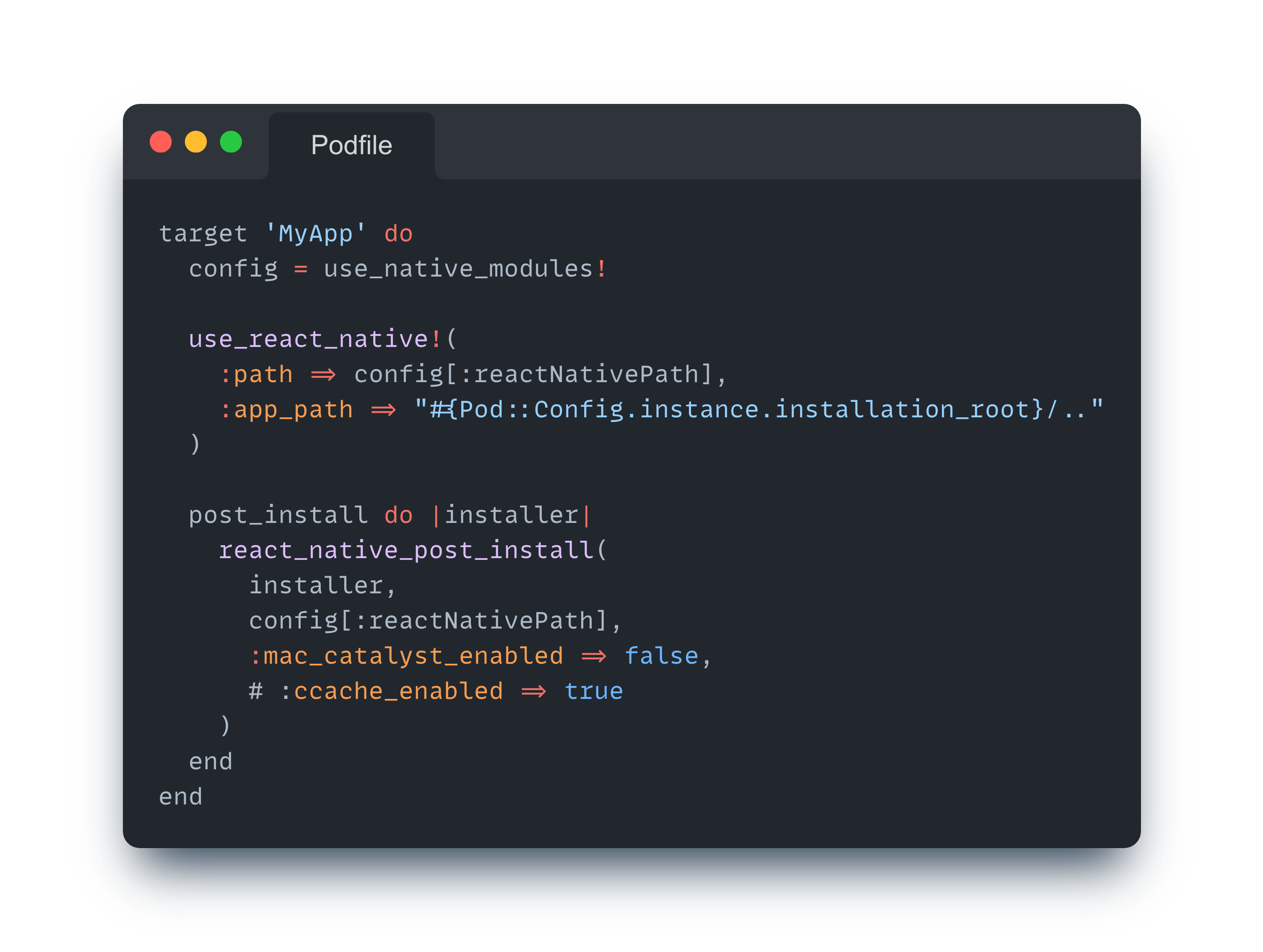 iOS의 경우에도 안드로이드와 유사하게 처리되는데, React Native 프로젝트의 Podfile을 열어보면 다음과 같은 코드를 볼 수 있다.