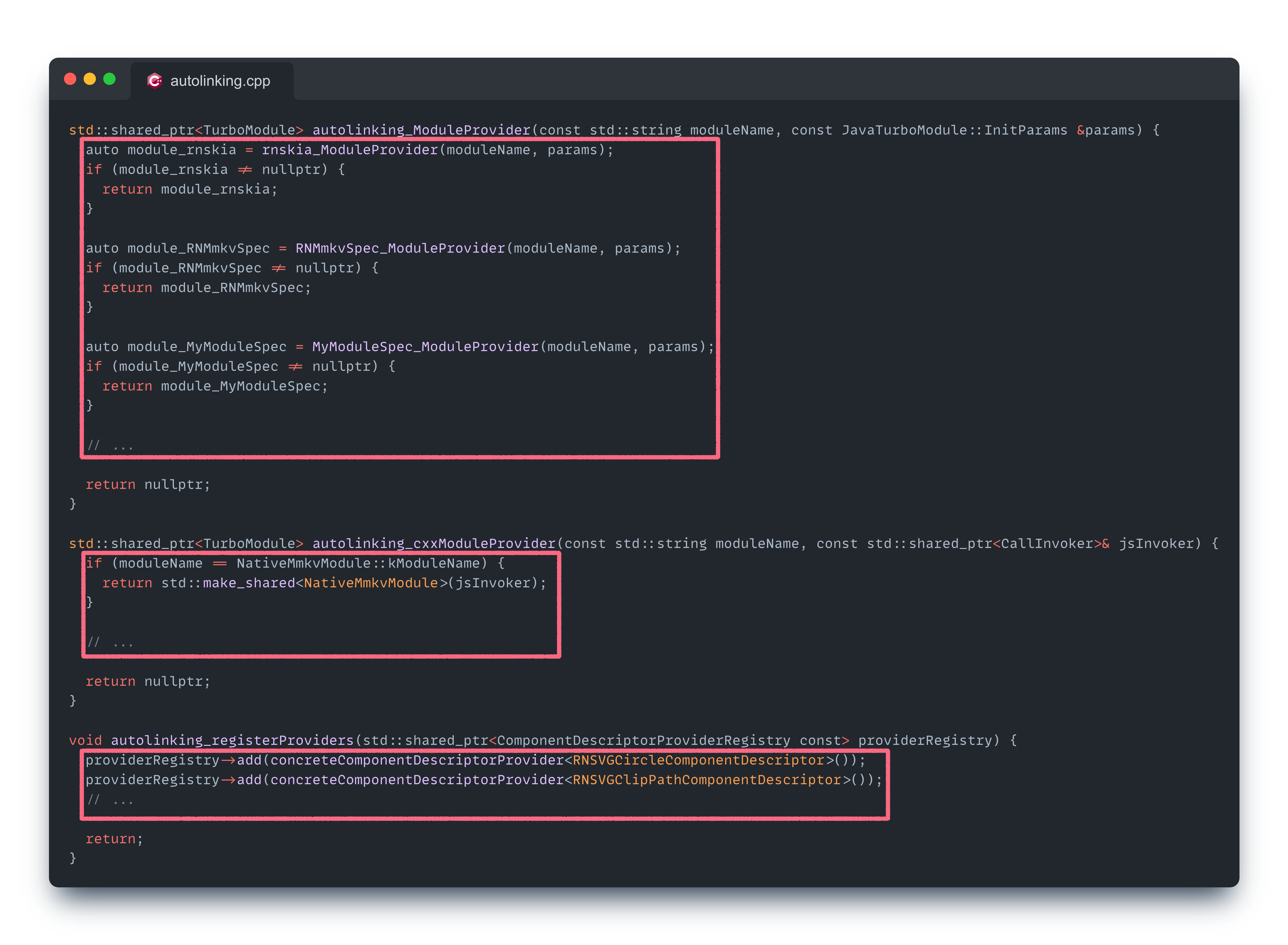 autolinking_ModuleProvider, autolinking_cxxModuleProvider, autolinking_registerProviders 함수들이 정의되어 있고, 각 함수의 구현체는 다음과 같은 형식으로 자동 생성된다.