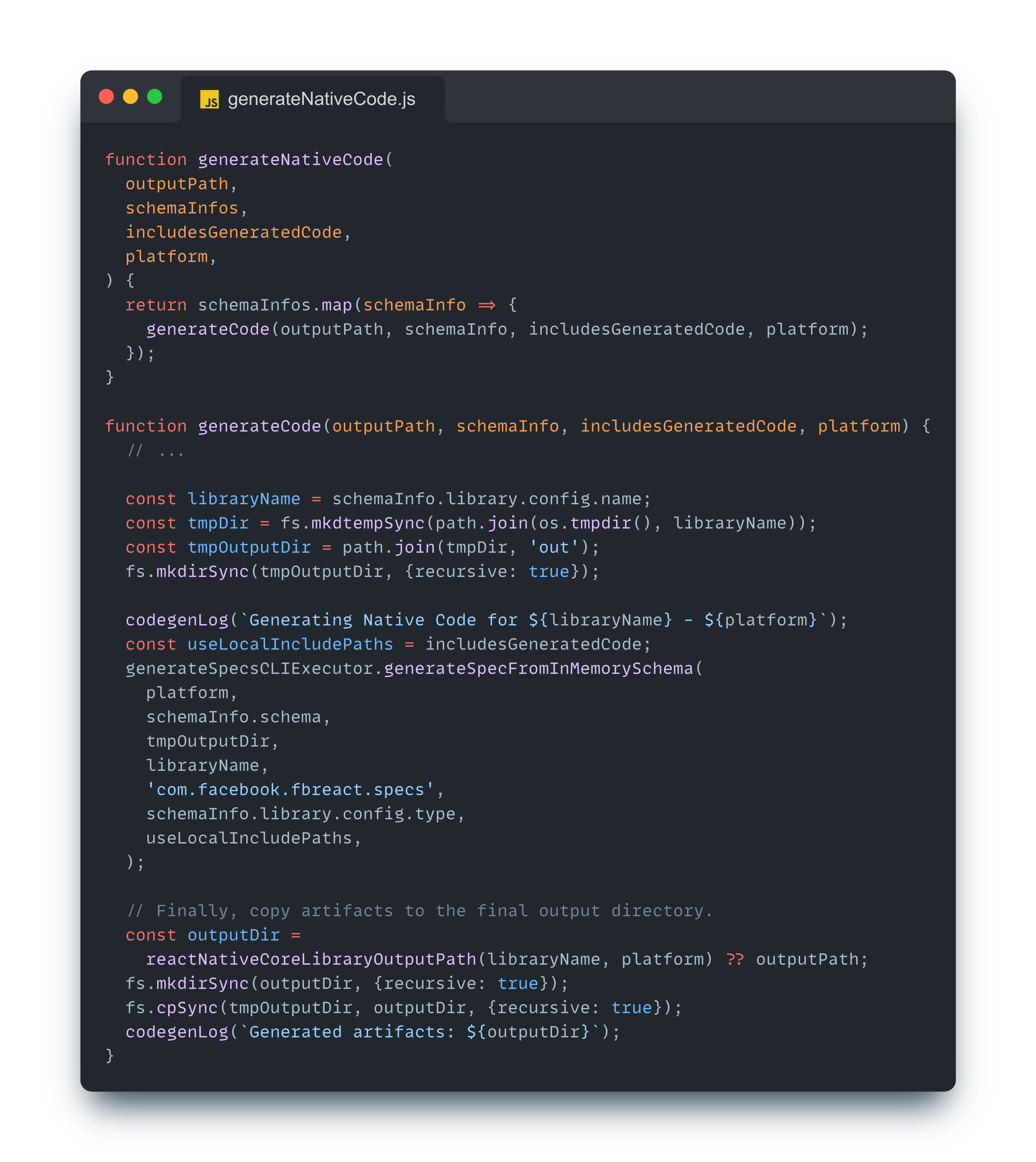 지금까지 Codegen이 어떤 과정을 거쳐 모듈 사양 정보를 수집하고, 스키마를 파싱하며, 어떤 네이티브 코드들이 생성되는지 살펴보았다.