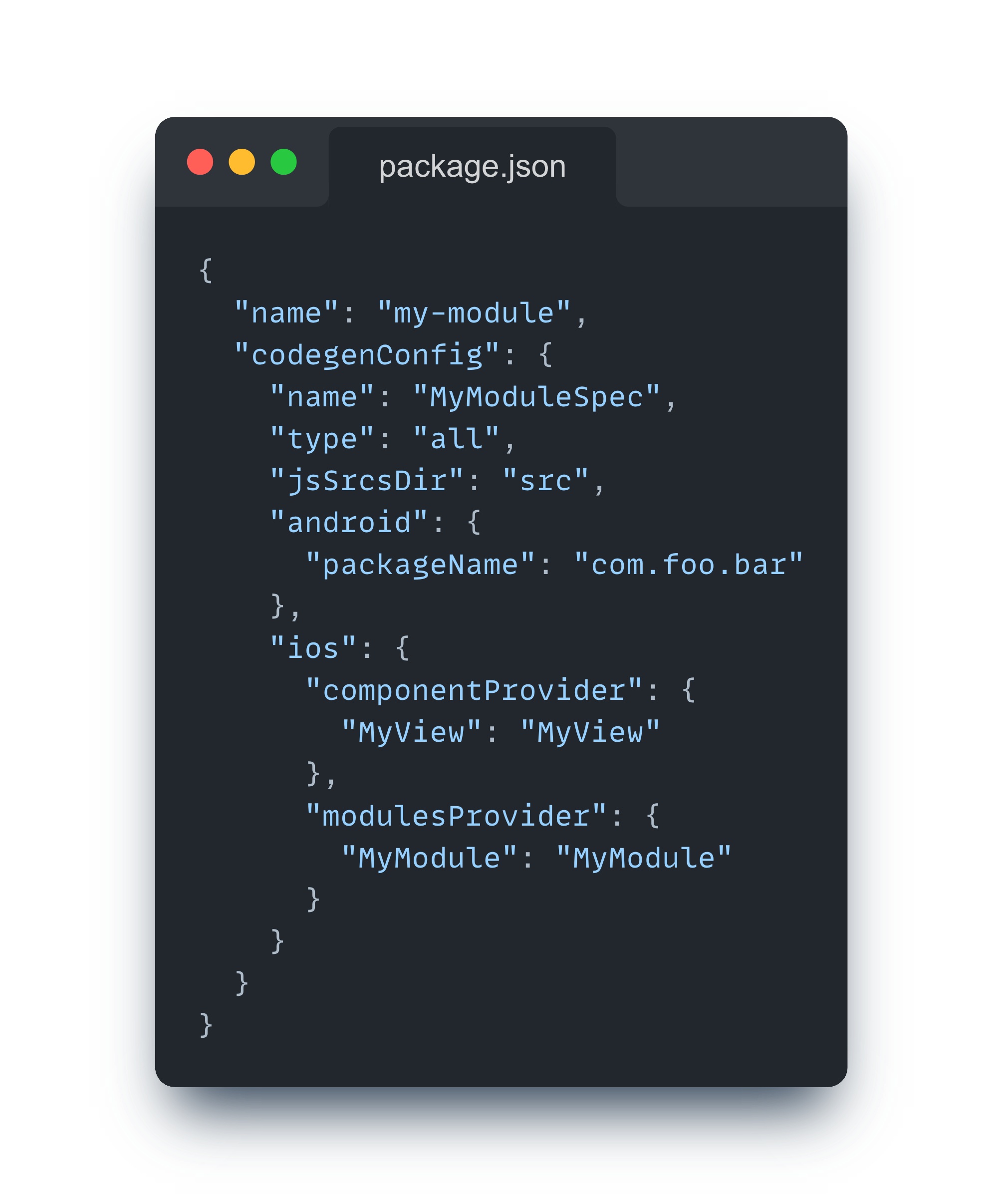 다음과 같이 package.json 파일에 codegenConfig 필드를 추가하고, 구성 추가하면 Codegen 준비 과정은 끝이다.
