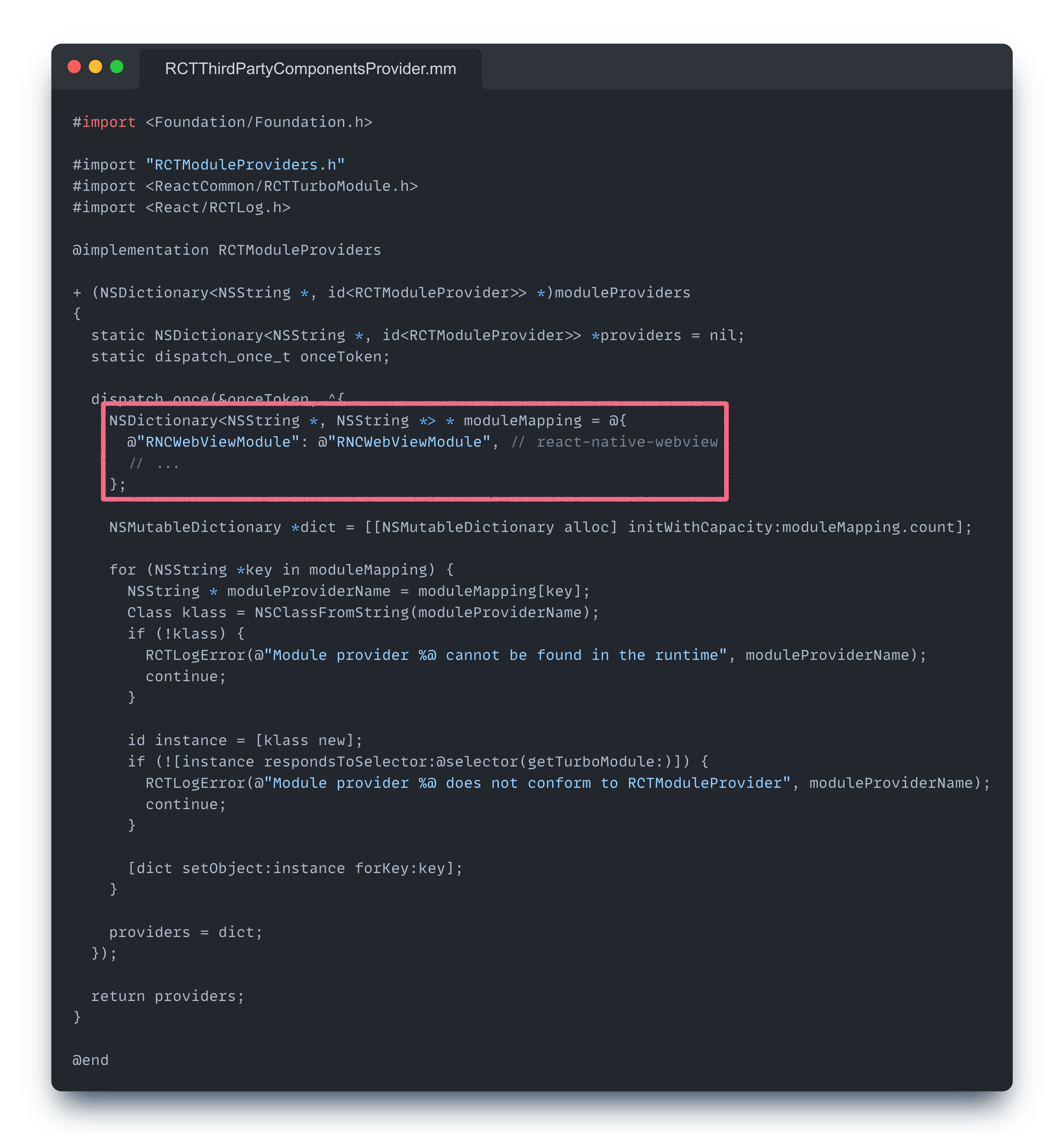 구현체를 보면 내부에서 Provider 들을 제공하고 있는 것을 확인할 수 있다. 각 Provider는 동일한 Codegen 경로 내에 생성(RCTModuleProviders, RCTThirdPartyComponentsProvider)되어있으며 각 파일은 다음과 같이 네이티브 모듈 혹은 뷰(View) 구현체를 바인딩하고 있다.