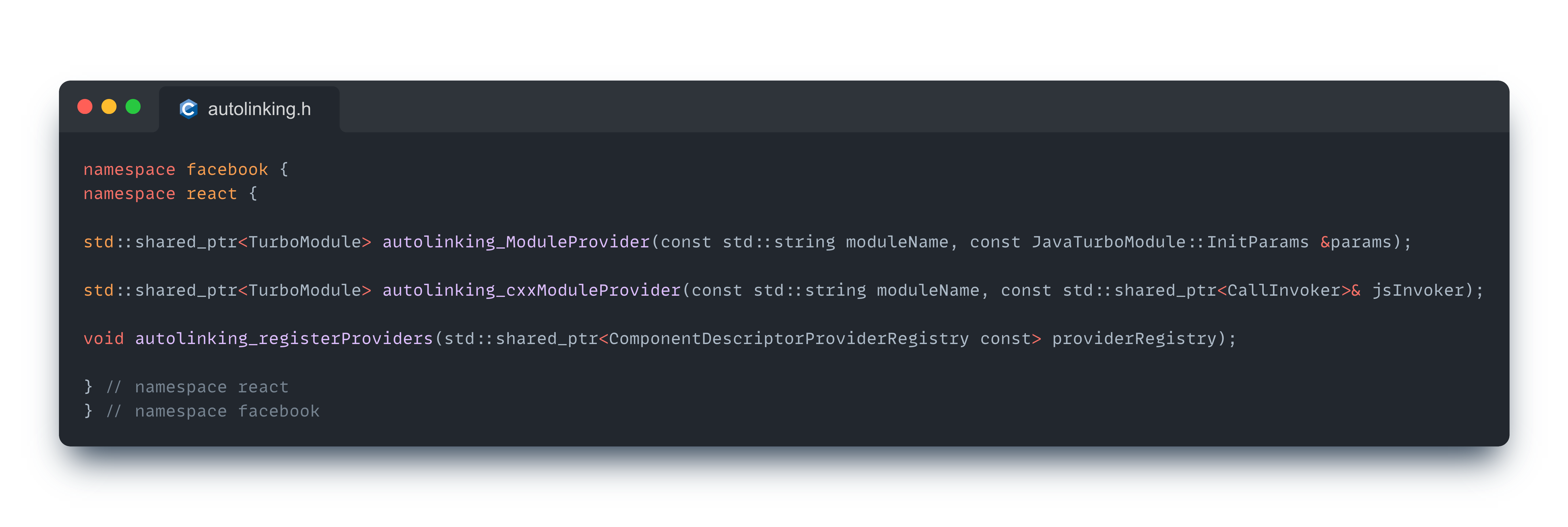 익숙한 이름들이 보이는가? 잘 기억하고 있으라고 했던 그 부분이다 (autolinking.h 내에 정의된 함수들). Codegen을 통해 생성된 C++ 기반 Provider들은 여기를 통해 참조된다.