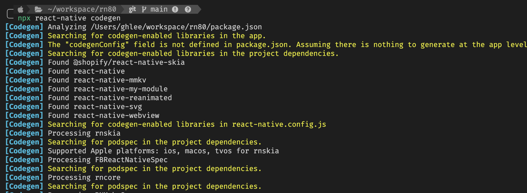 React Native 프로젝트 루트 경로에서 실행하면, 프로젝트 내에 존재하는 네이티브 모듈, 설치되어 있는 의존성 정보를 탐색하여 네이티브 코드를 생성해 준다.