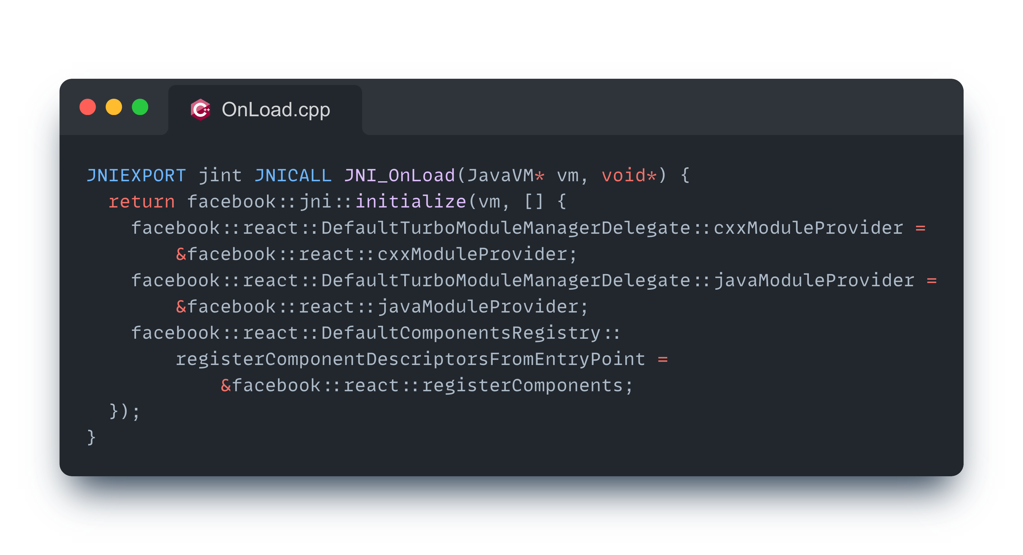 안드로이드에서 React Native 애플리케이션이 실행될 때 JNI가 초기화되는데, 이 코드를 잠시 살펴보자