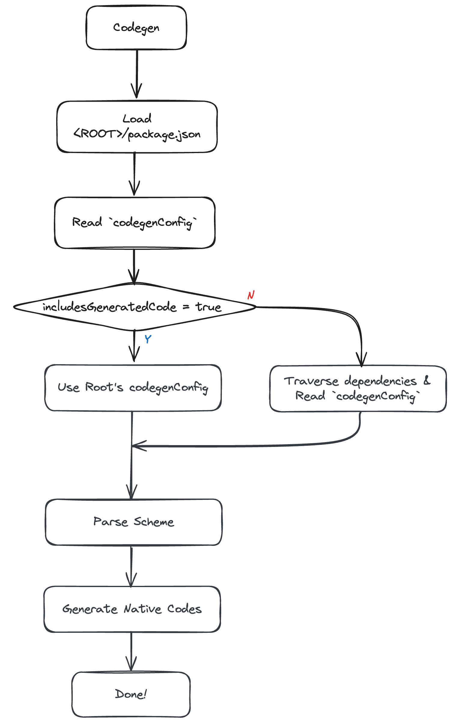 만약 codegenConfig.includesGeneratedCode 옵션이 활성화되어있는 경우 Codegen에 의해 생성된 코드들이 포함되어있음을 의미하므로 루트 package.json 에서 찾은 라이브러리만 Codegen 대상으로 처리한다.