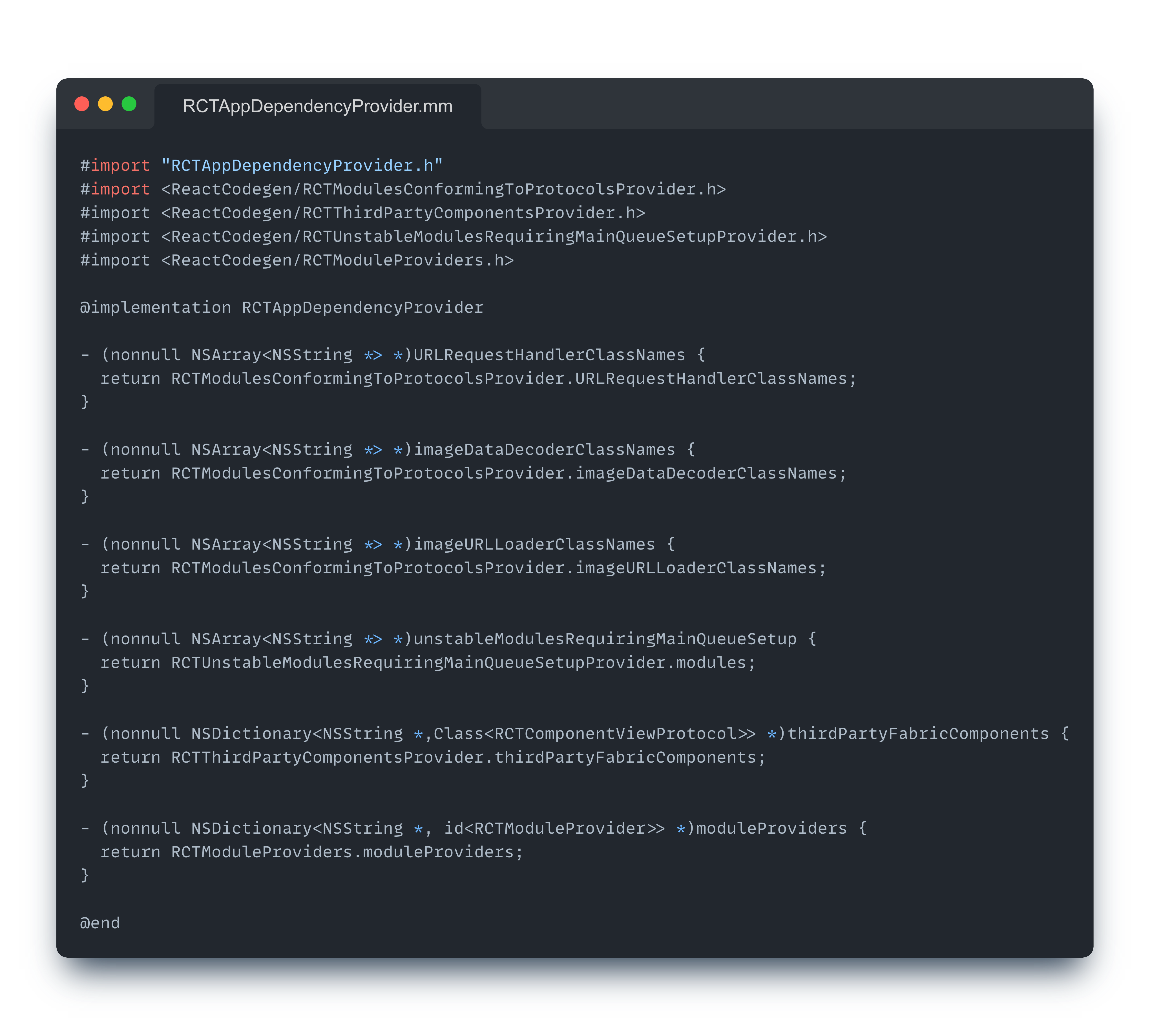 안드로이드와 동일하게 Codegen된 네이티브 모듈들을 각 Provider가 제공하고 있음을 확인할 수 있고, Provider 들은 RCTAppDependencyProvider에 포함되는 것을 확인했다.