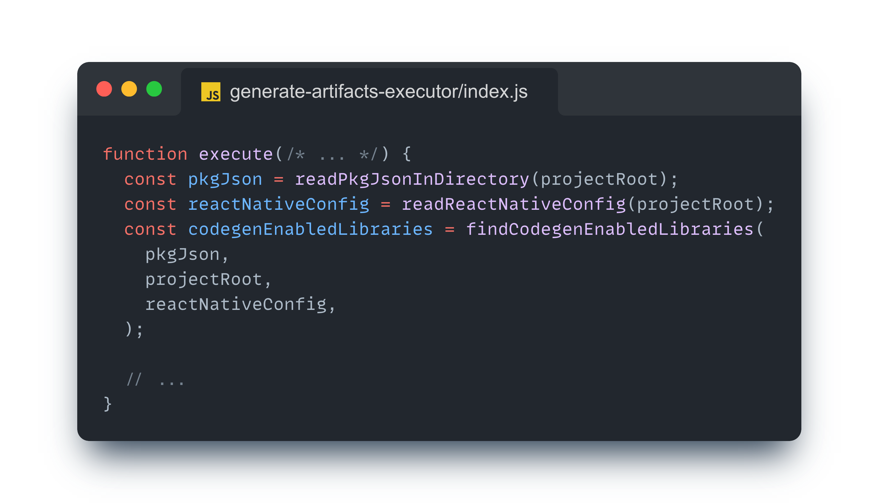 Codegen 명령어는 기본 react-native.config.js 파일 내에서 등록되고 있고, 명령어의 실제 구현체는 generate-artifacts-executor 이다.