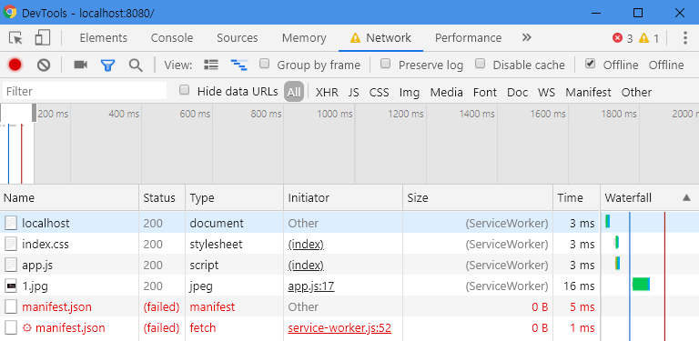 위의 localhost (index.html을 의미함), index.css, app.js, 1.jpg가 오프라인 상태에서 정상적으로 로드되었습니다!