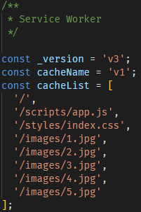 앞으로 캐시 리스트의 항목이 변경될 때 마다 cacheName을 변경해주며 이전에 사용하던 캐시를 지울 수 있도록 해야합니다.