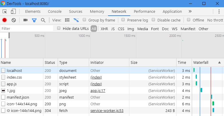 위의 localhost (index.html을 의미함), index.css, app.js, 1.jpg가 오프라인 상태에서 정상적으로 로드되었습니다!