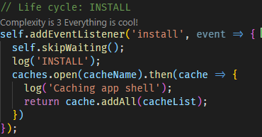 우리는 필요한 리소스(앱 셸)들을 캐싱해야 하기 때문에 waitUntil을 통해 설치 단계를 연장시켜야 합니다.